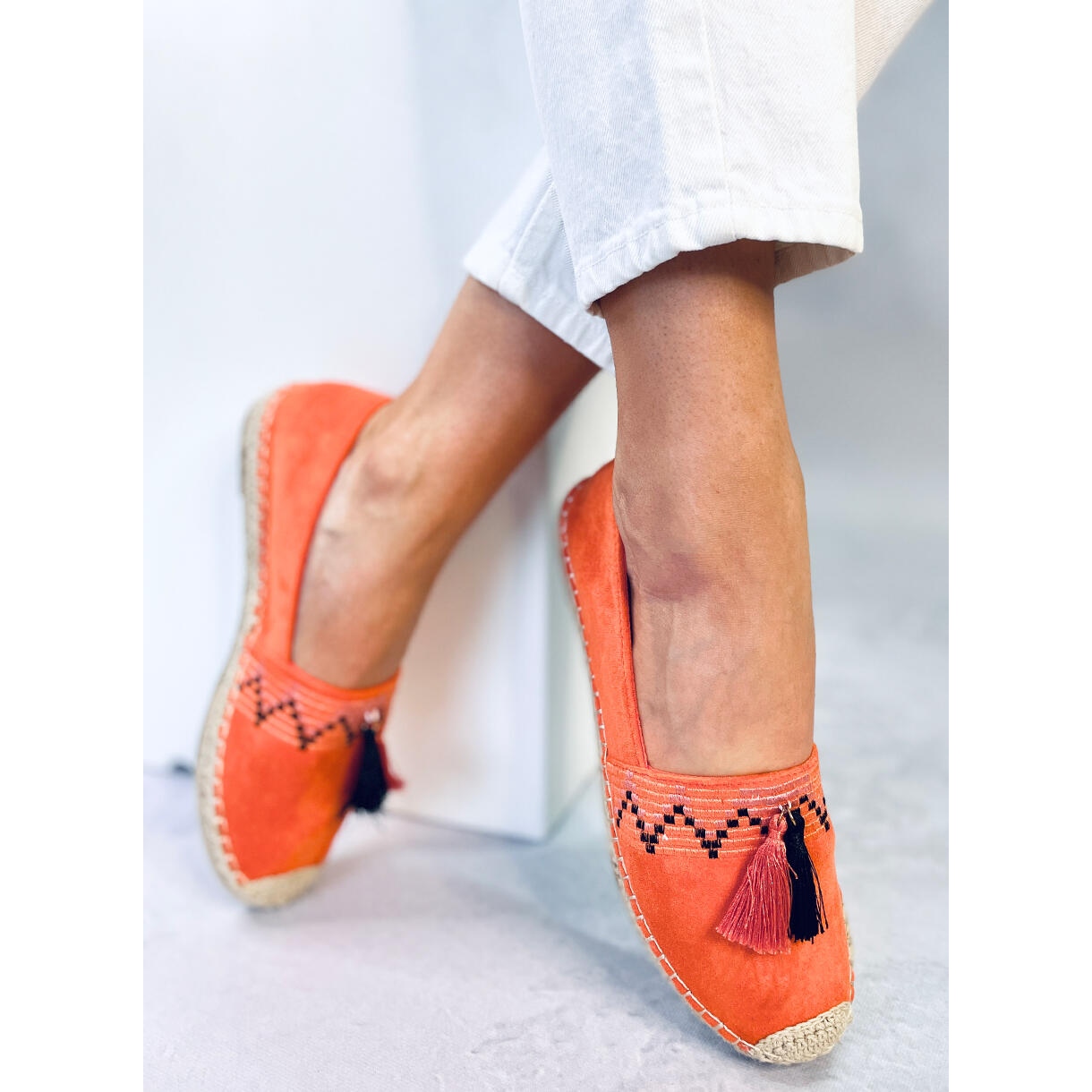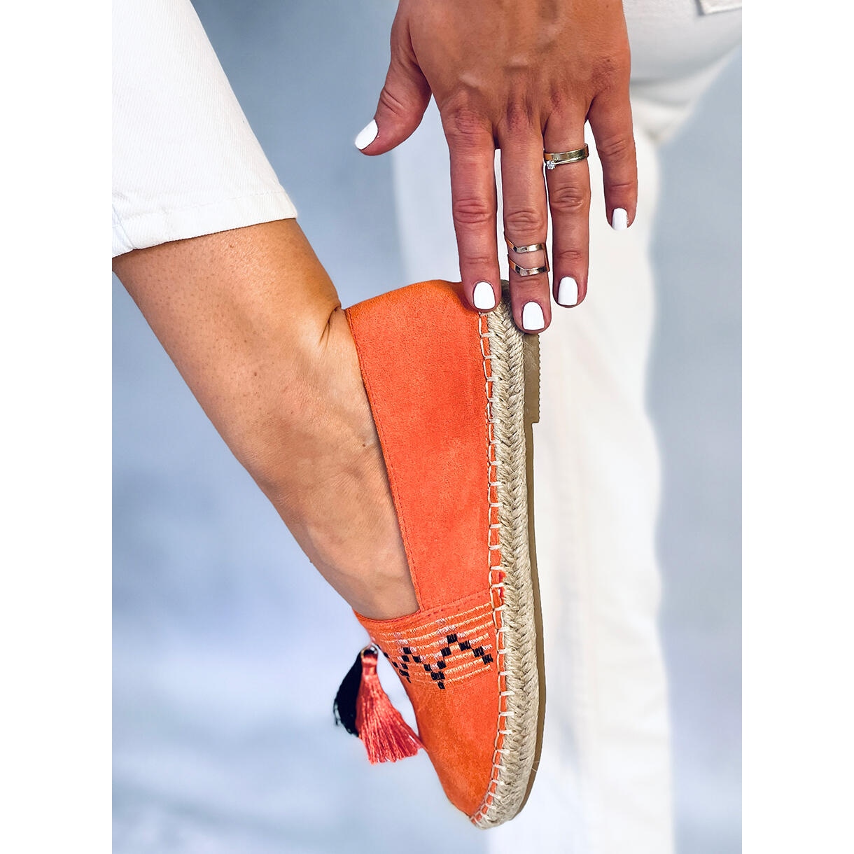 Espadrilles femme à franges. Le modèle présente des nez arrondis tressés d'une ficelle de lin, ainsi qu'un motif brodé unique. Ils sont beaux sur la jambe! Tous les amoureux du style bohème seront sûrement ravis :) Ils sont en daim écologique, et l'intérieur est doublé de tissu.