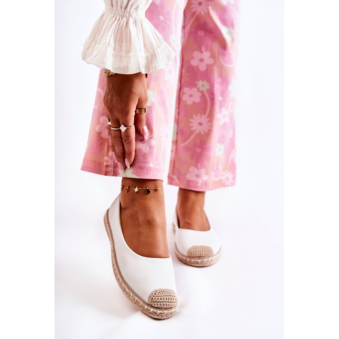 Nous vous présentons des espadrilles classiques en cuir pour femmes dans une élégante nuance de blanc avec des accents beiges - le modèle Calabria. Ces chaussures élégantes en éco-cuir allient confort et design à la mode, s'adaptant parfaitement à différents styles d'été.
