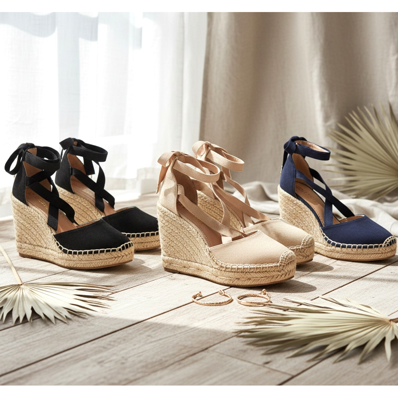 L'élément clé de ces chaussures est une semelle composée de ficelle tressée (jute) et d'un lien autour de la cheville (souvent avec un ruban). La cale offre une stabilité et un confort qui manquent aux talons hauts fins, tout en ajoutant quelques centimètres de hauteur et en affinant le mollet. Ces chaussures sont parfaites pour les promenades de vacances, les rendez-vous et les fêtes d'été.
