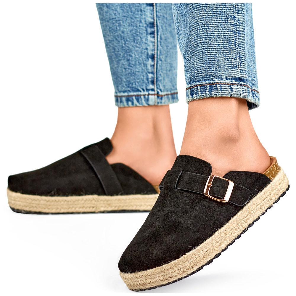 Découvrez l'élégance et le confort dans les stylisations de tous les jours grâce aux volets couverts des espadrilles pour femmes avec une boucle dans une couleur noire classique. Une autre marque lance un modèle qui combine le design moderne et les fonctionnalités. Fabriqués en daim écologique de haute qualité, ces tongs sont non seulement élégants, mais aussi respectueux de l'environnement.