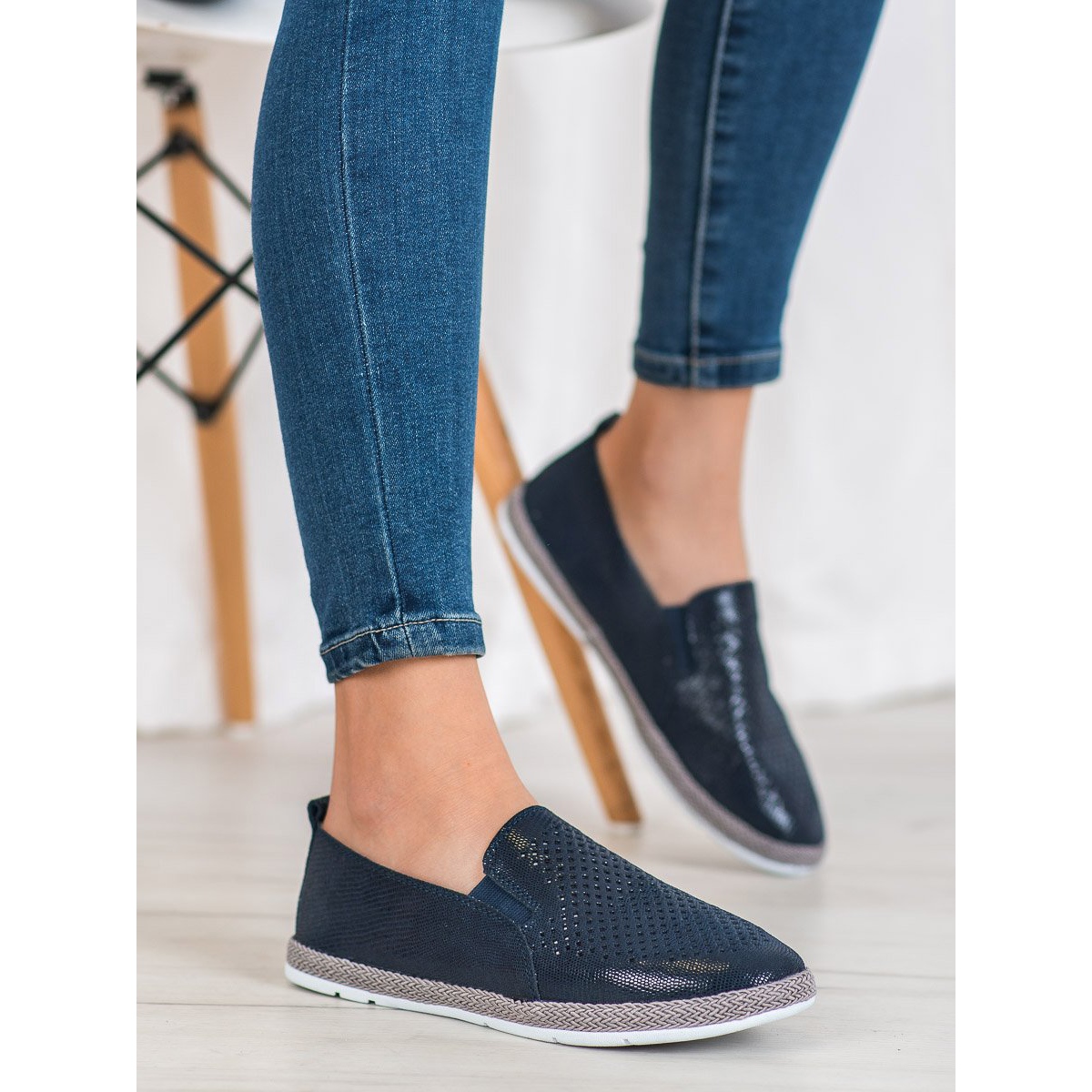 La tige bleu marine est ornée d'un motif ajouré composé de trous régulièrement espacés, qui ajoute de la légèreté et une note d'unicité. Une semelle plate et lisse en matière synthétique assure un confort de port, et un talon doux et intégré enveloppe le pied, assurant la stabilité pendant la marche.