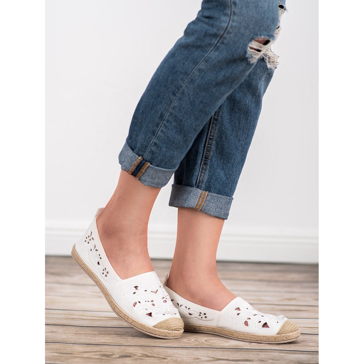 Nous vous présentons les espadrilles VICES blanches - des chaussures parfaites pour les journées d'été ! Ces espadrilles élégantes en daim de haute qualité sont un choix parfait pour les femmes à la recherche de chaussures confortables et à la mode. L'utilisation de matériaux solides et de connexions durables garantit durabilité et confort de port.