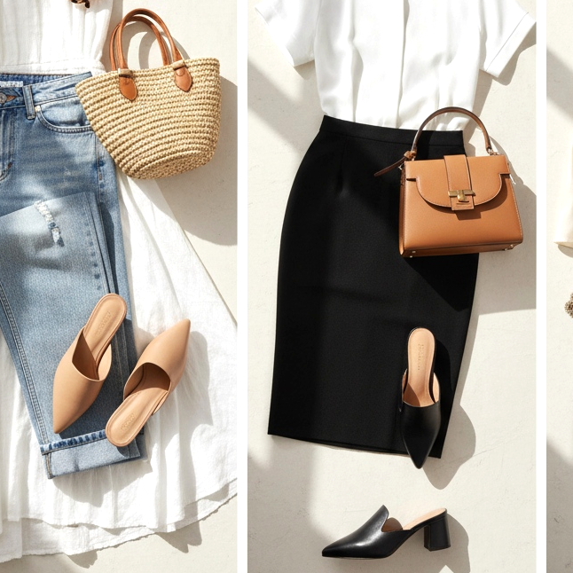 tous les jours. Les mules plates en cuir noir, blanc ou beige sont le choix parfait pour les sorties quotidiennes. Portez-les avec un jean retroussé, un pantalon en lin et des robes amples. Ajoutez un sac à main en paille et des lunettes de soleil et vous obtiendrez un look prêt à l'emploi pour une journée d'été.
