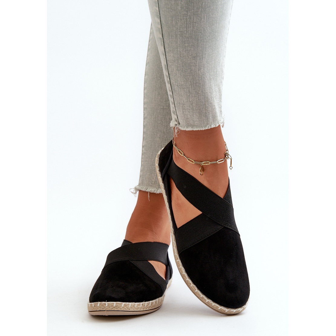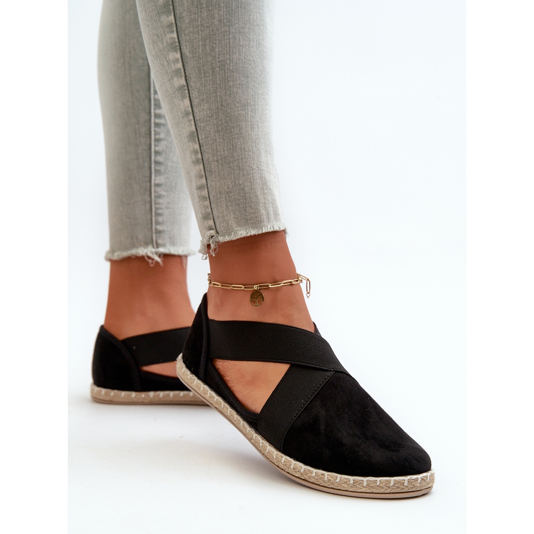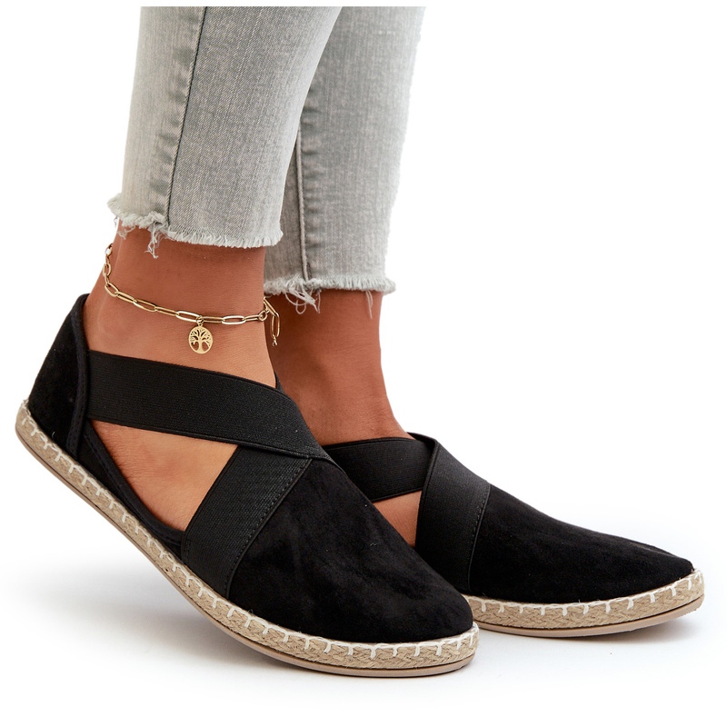 Ressentez la légèreté et le style à chaque pas avec les espadrilles pour femmes à bretelles élastiques, en suède écologique noir.