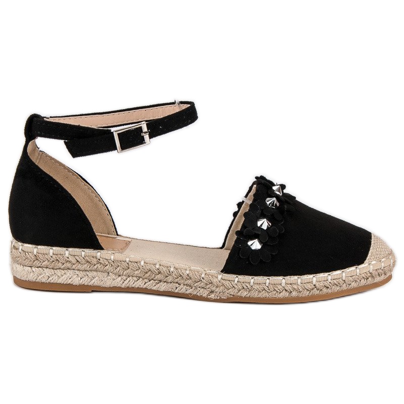 Les espadrilles noires se distinguent par un bout rond, ce qui les rend extrêmement confortables et s'adapte à tous les pieds. La fermeture à boucle ajoute du caractère et permet un ajustement parfait à la jambe. De plus, les clous utilisés donnent aux chaussures un look saisissant et en font un accent unique dans n'importe quel style.