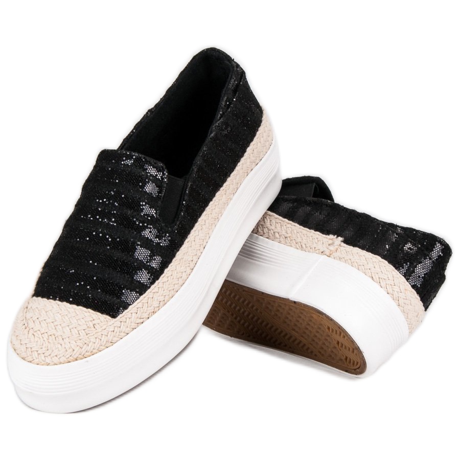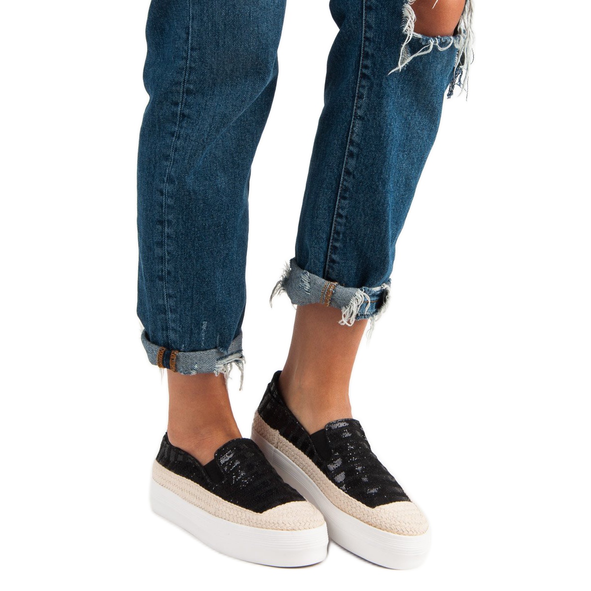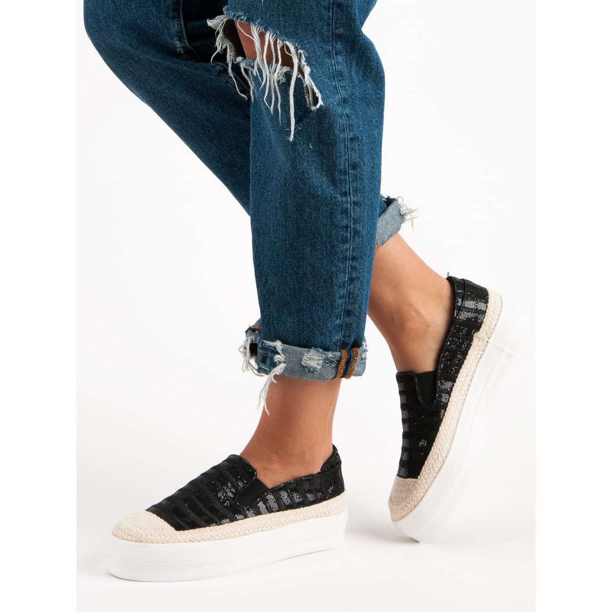 Fabriquées en matière textile de haute qualité, les espadrilles noires se caractérisent par un talon souple et une semelle en caoutchouc avec bande de roulement, qui assure stabilité et sécurité lors de la marche. De plus, il y a un insert confortable à l'intérieur, ce qui augmente encore le confort d'utilisation. Dotées d'une semelle haute (3,0 cm), ces chaussures non seulement absorbent parfaitement les chocs, mais isolent également bien du sol.