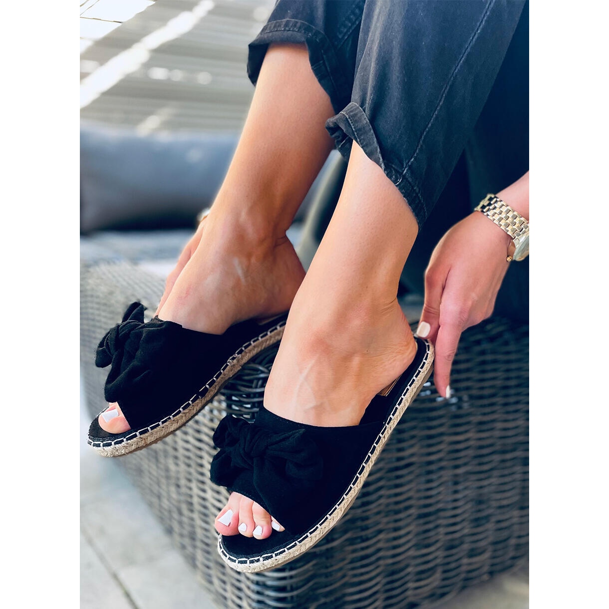 Les tongs espadrilles Larysa Black sont un choix parfait pour les femmes à la recherche de confort et de style les jours d'été. Fabriquées en daim écologique de haute qualité, ces claquettes noires se distinguent par une semelle tissée de ficelle de lin, qui leur confère légèreté et un caractère estival. Un charmant nœud placé sur la tige ajoute du charme et en fait un excellent complément au style de tous les jours.
