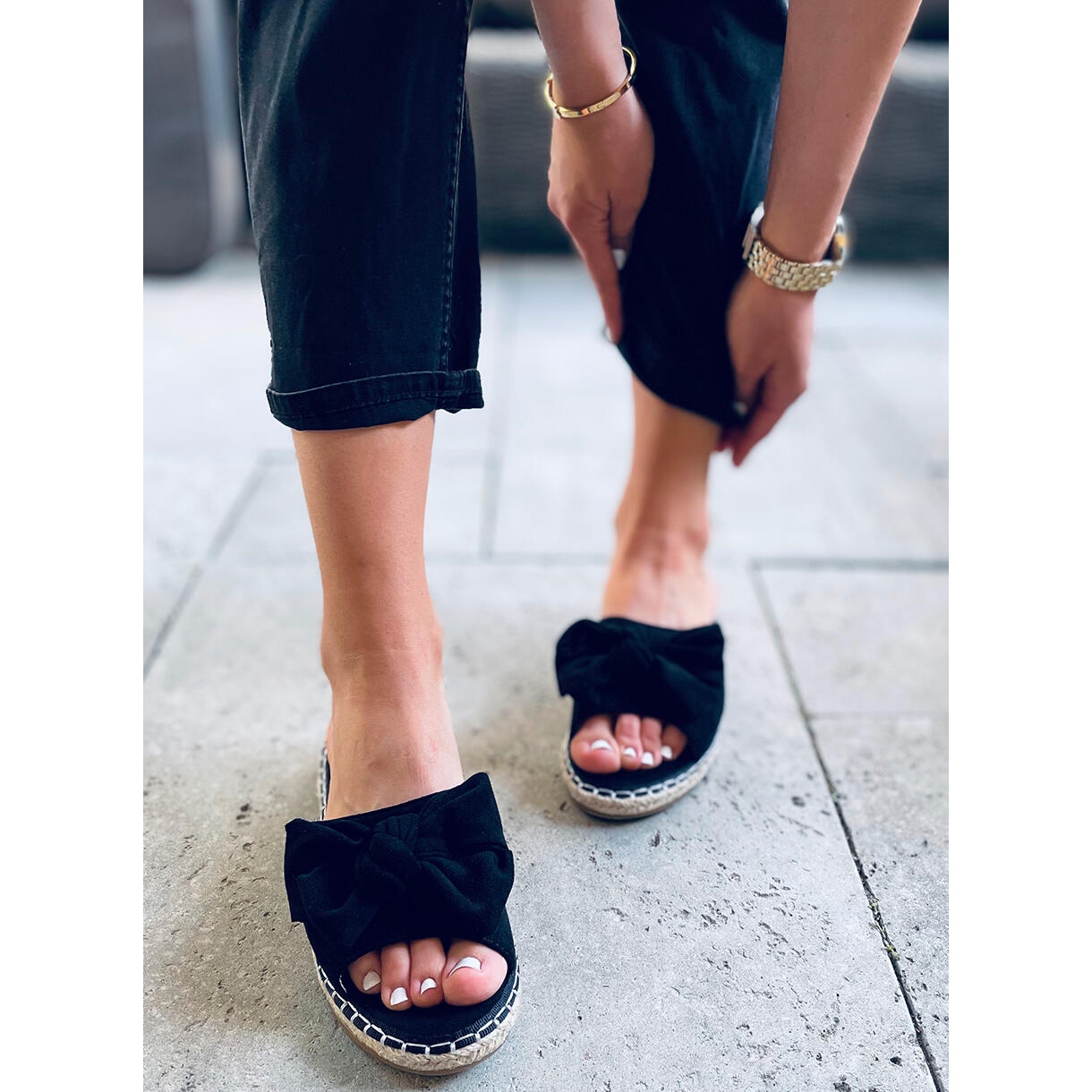 Ces espadrilles ne sont pas seulement des chaussures confortables, mais aussi un accessoire de mode qui devrait figurer dans toute garde-robe estivale. N'attendez pas ! Choisissez les tongs Larysa Black et profitez de l'été en tout confort et style.