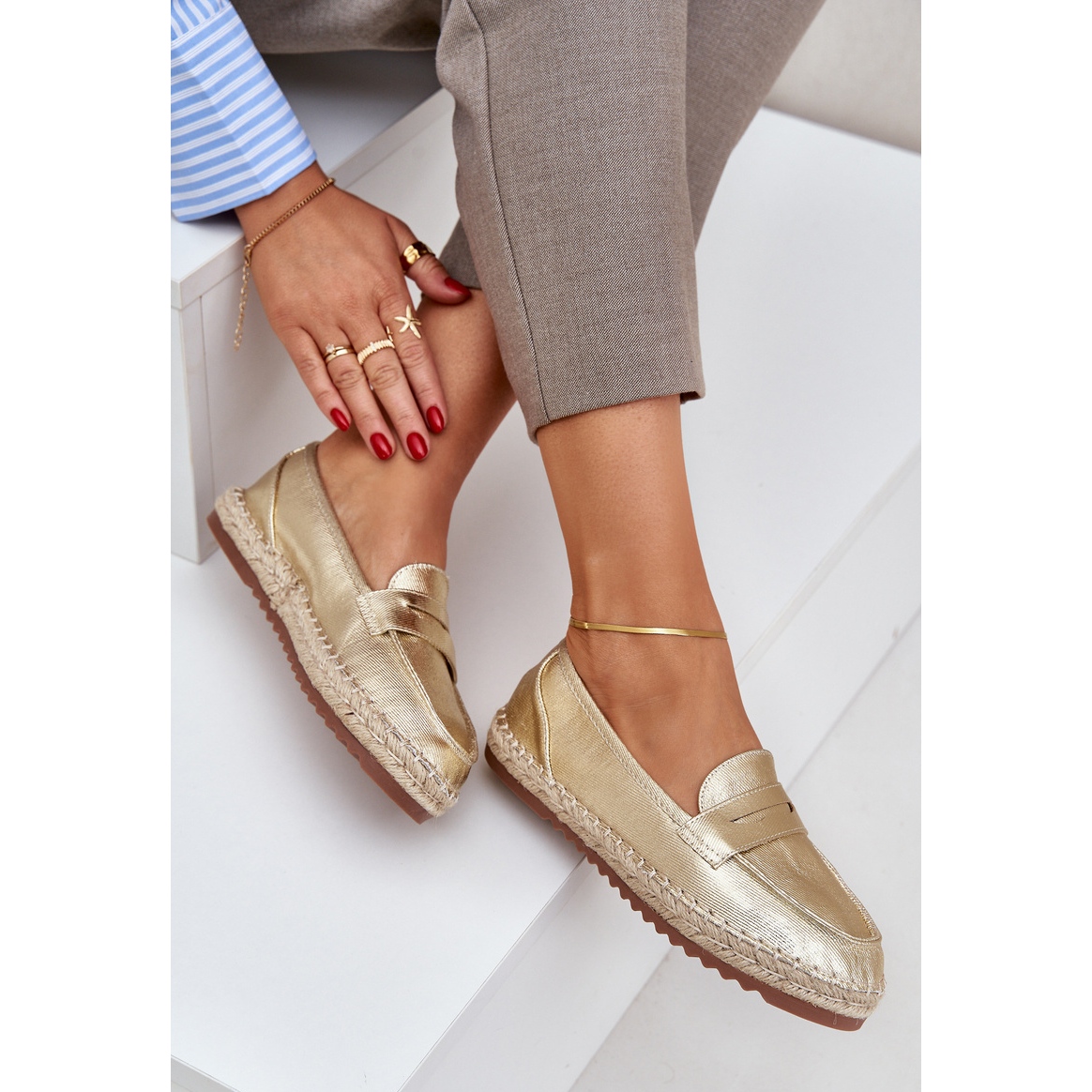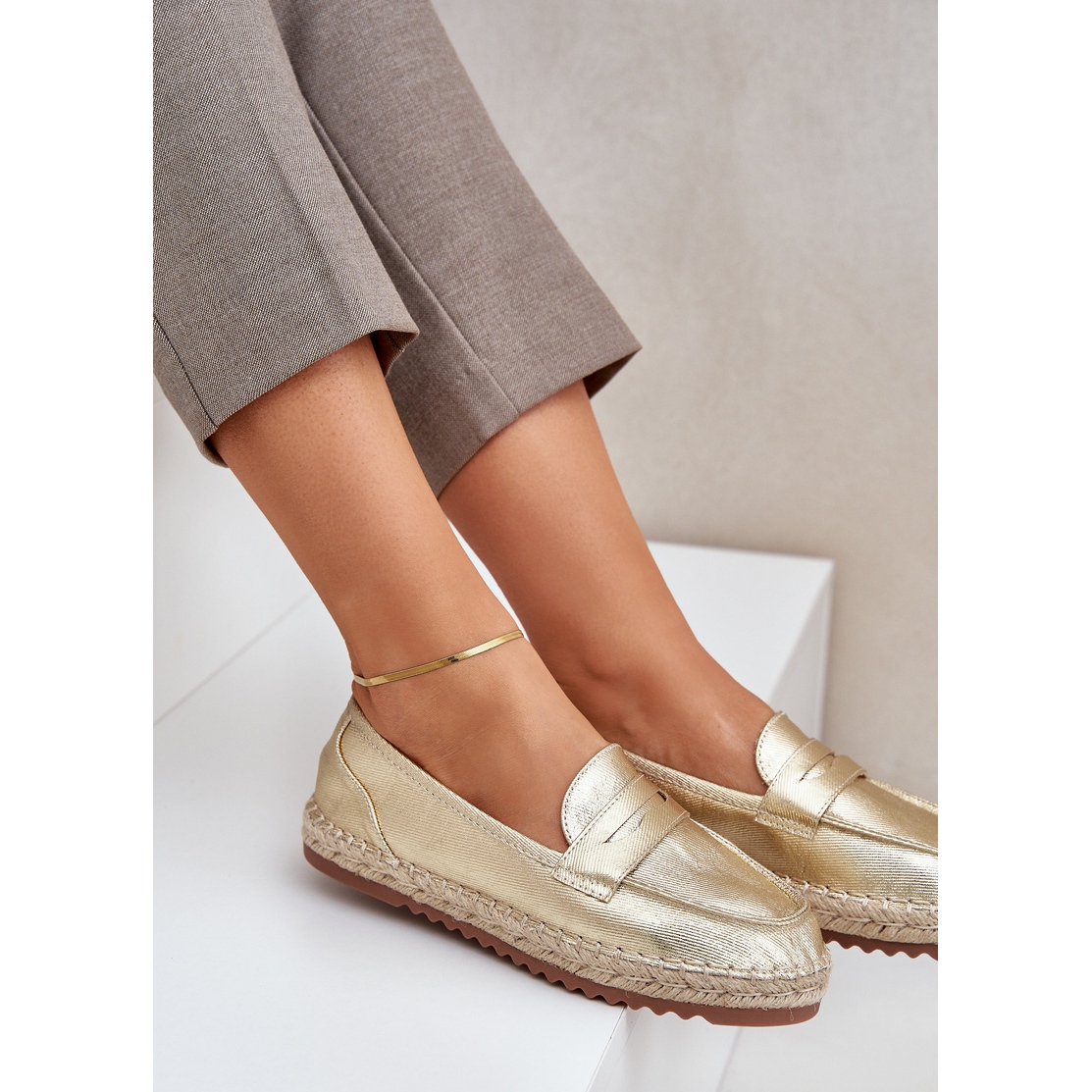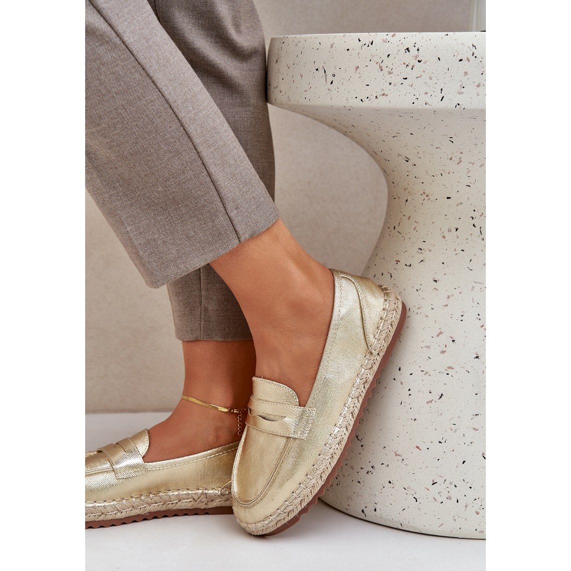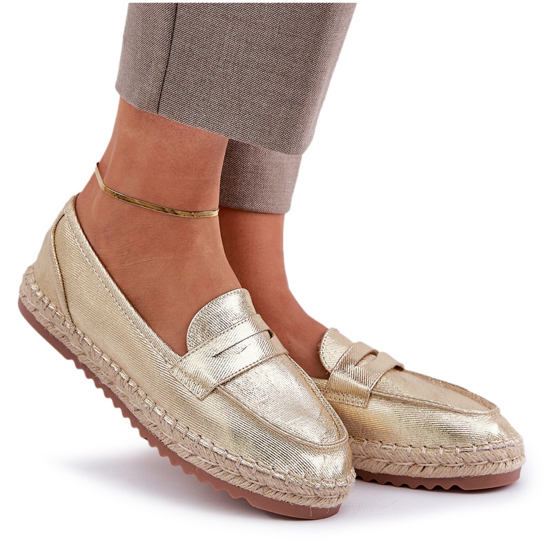 Voici les espadrilles parfaites pour chaque femme à la mode qui veut combiner le confort avec l'élégance - les espadrilles féminines avec une tresse de jute sur une semelle plate dans une couleur dorée unique. Fabriqués en cuir écologique de haute qualité, ces chaussures légères seront un excellent choix pour les journées chaudes.
