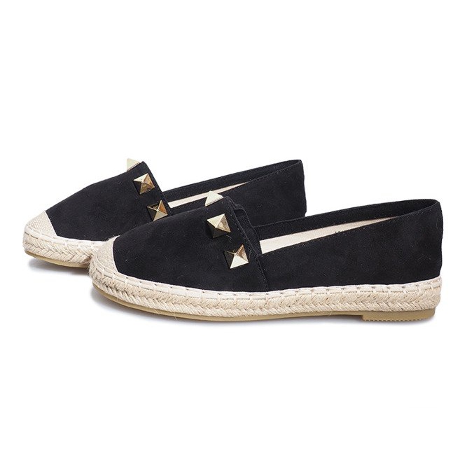Le haut des espadrilles est réalisé dans un matériau semblable à du daim d'une élégante couleur noire, ce qui leur confère élégance et classe. Un avantage supplémentaire sont les clous dorés placés sur le devant, qui attirent subtilement le regard et ajoutent de l'originalité.