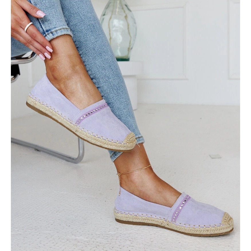 La couleur violette, dans une nuance aux charmants tons violets, attire l'attention et ajoute de la fraîcheur aux coiffures estivales. La combinaison de la couleur du cuir écologique suédé avec l'éclat subtil des zircons cubiques fait de ces espadrilles un élément incontournable de votre garde-robe de vacances.