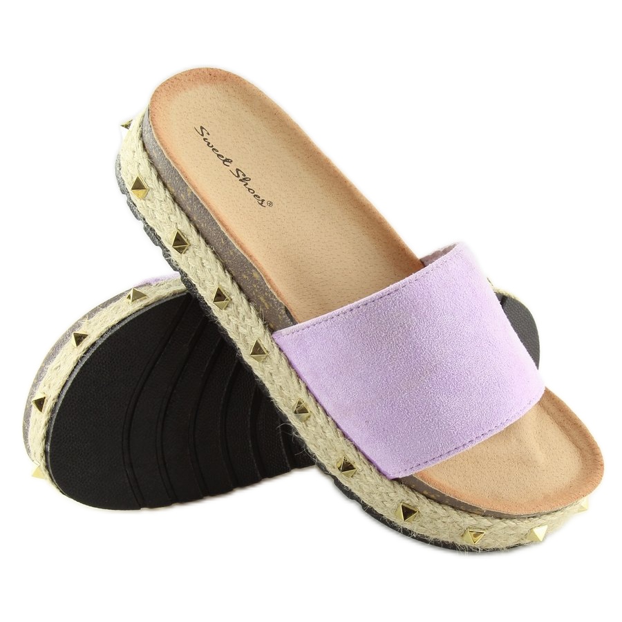 Les tongs espadrilles Violet LS51 L.PURPLE sont un choix idéal pour les femmes qui apprécient le confort et un look tendance. Ces tongs élégantes avec une semelle haute en liège combinent les dernières tendances du monde de la chaussure. La semelle, tressée avec de la ficelle de lin, est ornée d'impressionnants clous en forme de pyramide, qui leur confèrent un caractère unique et leur permettent d'attirer tous les regards.