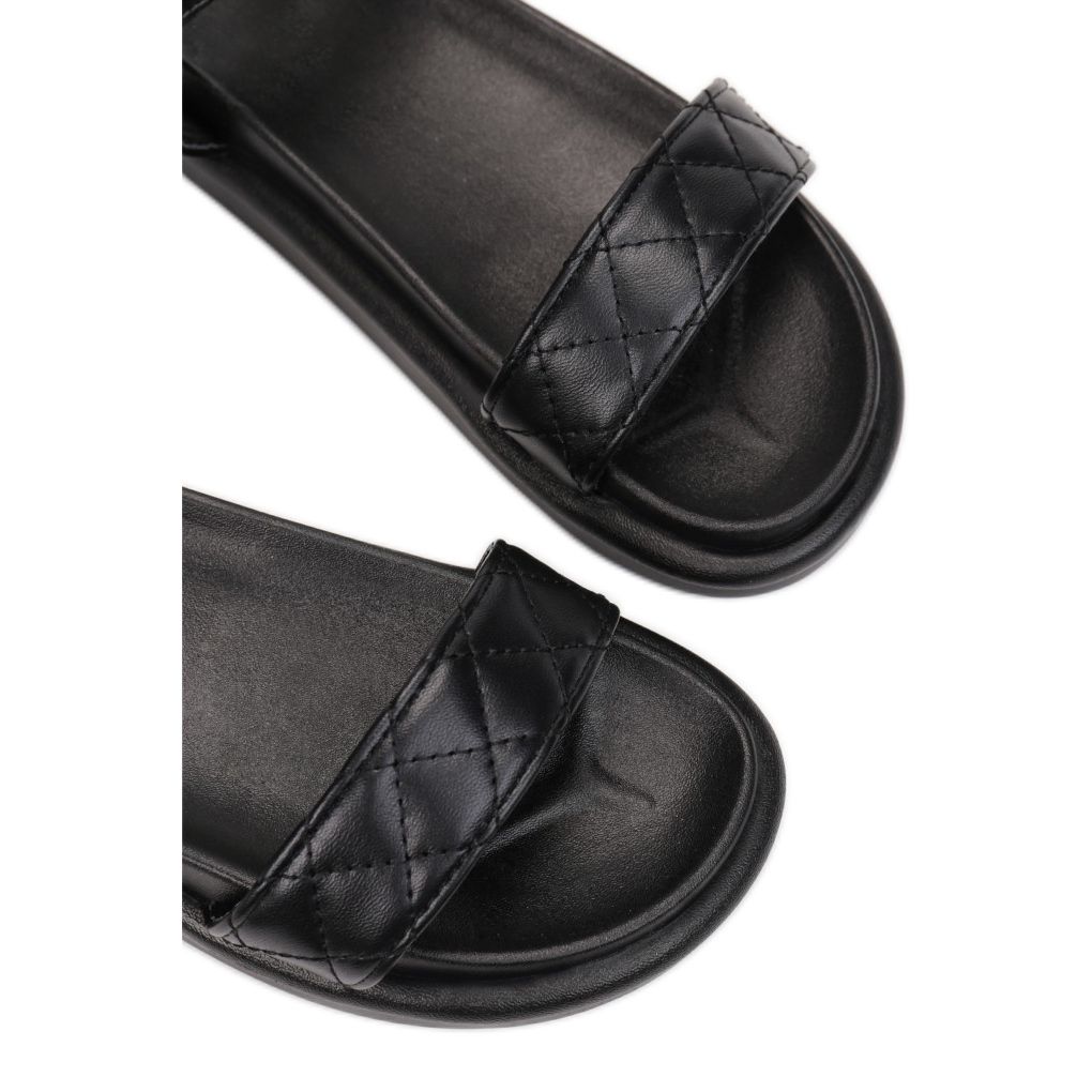 Les chaussures sont fermées par un fermeture scratch pratique, ce qui permet de les enfiler et de les enlever extrêmement facilement. Montées sur une semelle plate profilée, elles offrent un confort sur toutes les surfaces et la hauteur du talon de 3 cm les rend adaptées à un usage quotidien. Fabriquées en éco-cuir de haute qualité, les sandales sont non seulement esthétiques, mais aussi faciles à entretenir, et les coutures matelassées ajoutent de l'originalité.