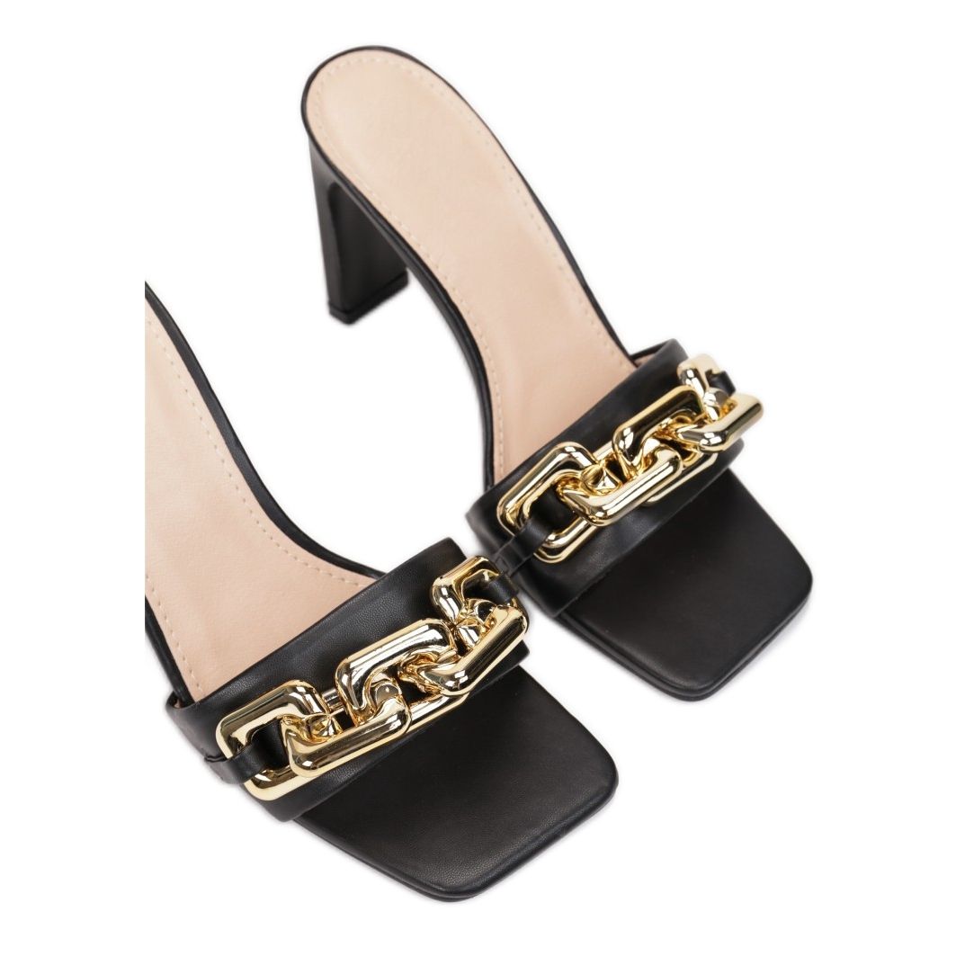 Nous vous présentons les tongs à talons hauts Vices 1C-38 dans une élégante couleur noire qui ravira sûrement tous les amoureux de la mode. Leur design classique a été complété par une touche moderne : une chaîne dorée décorant une large ceinture. Les tongs ont un talon de 9,5 cm, ce qui ajoute une silhouette plus fine et assure en même temps un port confortable grâce à leur design à enfiler.