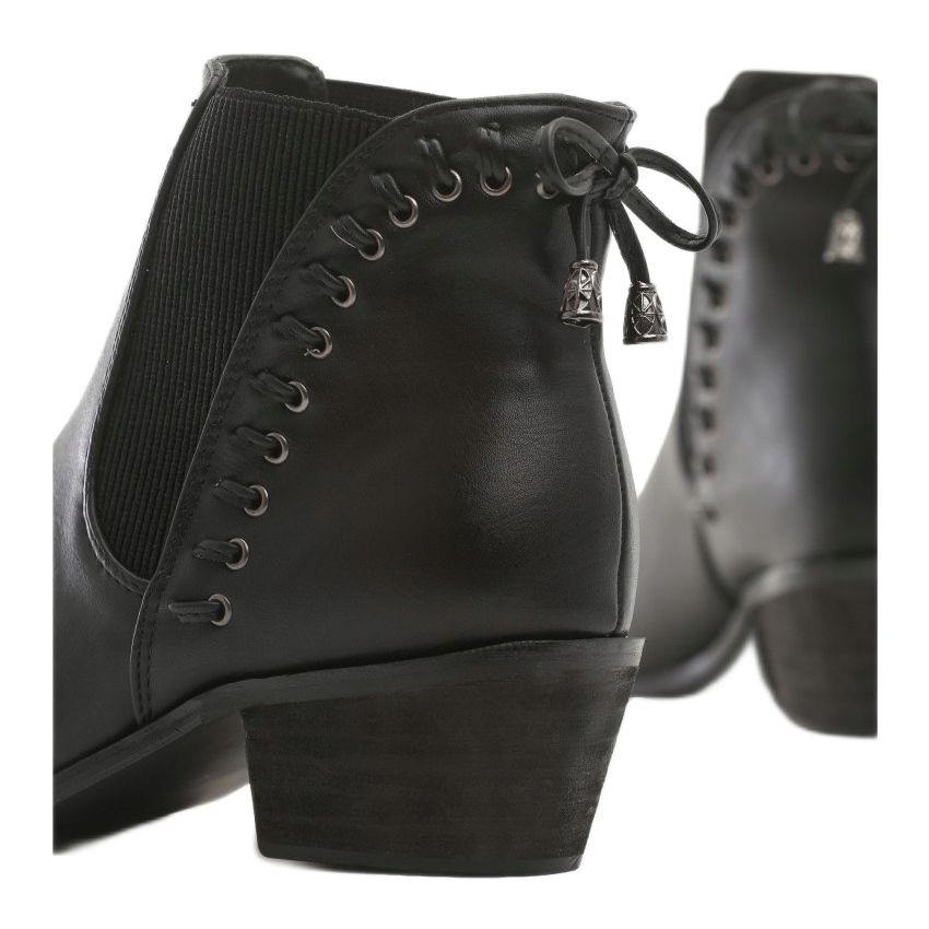 Les bottines Vices se caractérisent par un talon plat d'une hauteur de 4,5 cm, qui assure stabilité et confort au porté. Des éléments supplémentaires, comme des strass, leur confèrent un caractère original légèrement rock. Avec un bout en amande, ces bottes ajoutent de l'élégance et rendent chaque pied unique.