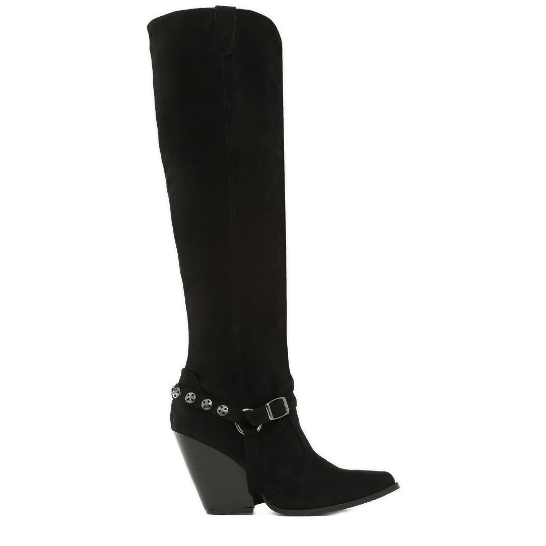 Les bottes se caractérisent par une tige arrivant au-dessus du genou et un bout en amande, ce qui leur confère un look extrêmement féminin et élégant. Grâce au talon haut confortable de 9 cm, vous pourrez profiter longtemps du style et du confort de port.