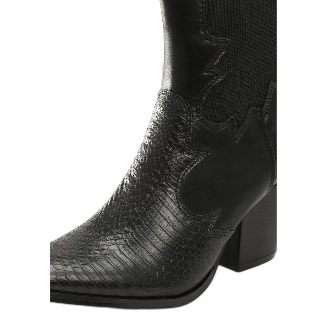 Les santiags Vices se distinguent par un talon conique de 8 cm de haut, qui ajoute une élégance subtile tout en assurant la stabilité. Le bout pointu souligne leur forme originale, ce qui en fait un complément parfait aux styles quotidiens et plus sophistiqués. Fabriqués en cuir écologique de haute qualité, ils sont non seulement visuellement attrayants, mais également respectueux de l'environnement.