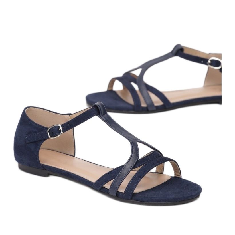 Le modèle se ferme à l'aide d'une fine bride dotée d'une élégante boucle en métal à la cheville, qui ajoute un charme délicat. Il y a une rayure élégante le long du cou-de-pied qui se combine avec des rayures subtiles au niveau des orteils, créant un ensemble harmonieux. Les sandales sont fabriquées en éco-daim, ce qui garantit la durabilité, et la semelle intérieure en éco-cuir augmente le confort d'utilisation.