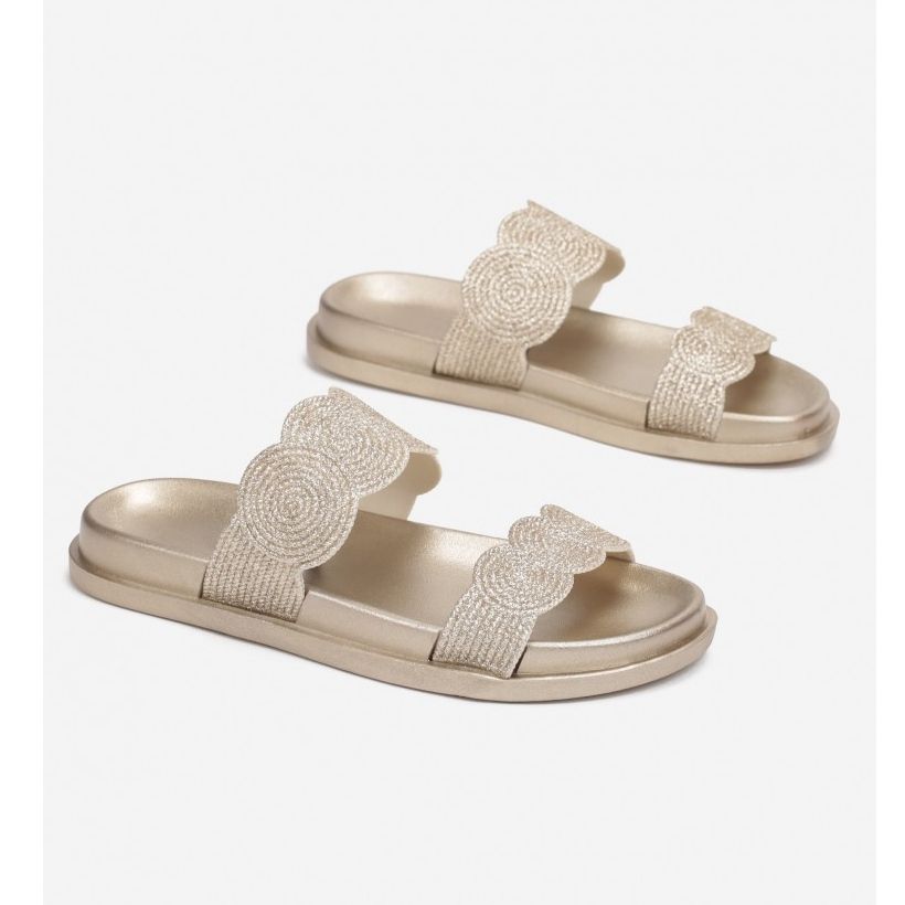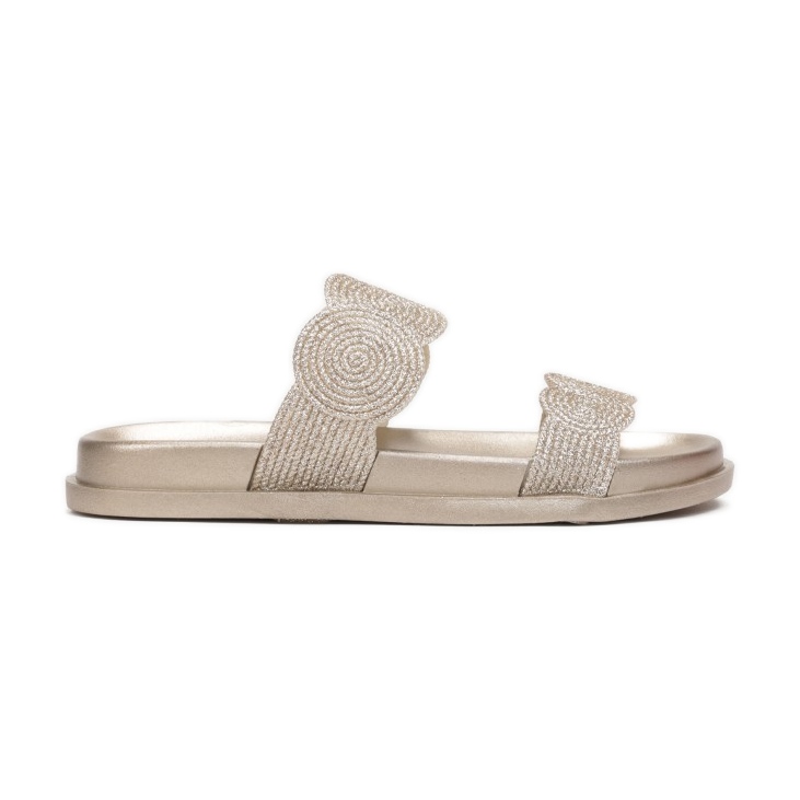 Nous vous présentons les claquettes à enfiler Vices GJ-3-60-gold, qui allient confort et style tendance ! Ces tongs uniques, d'une élégante couleur dorée, attirent l'attention par leur forme originale et leurs impressionnantes rayures ondulées décorées de paillettes. Grâce à la pointe et au milieu du pied exposés, vos pieds peuvent respirer et vous vous y sentirez à l'aise toute la journée.