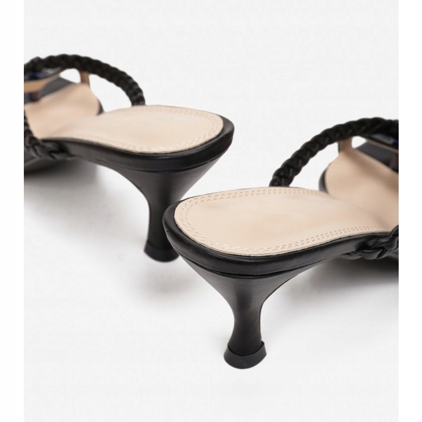 Le design des tongs se distingue par un bout carré, ce qui leur confère un caractère moderne. Une fine bride longitudinale au niveau des orteils et une bride triangulaire soigneusement tressée sont des détails qui attirent le regard et soulignent l'élégance de l'ensemble du modèle. Fabriquées en éco-cuir, les tongs sont non seulement élégantes, mais aussi pratiques et faciles à entretenir.