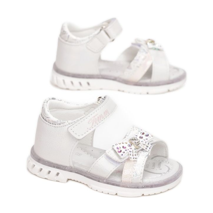 Le confort est une caractéristique clé du T9225. Un contrefort de talon rigide et une semelle intérieure en cuir assurent un confort de port tandis que des fermetures fermeture scratch pratiques permettent d'enfiler et de retirer facilement les sandales. Des décorations supplémentaires - des rayures à effet holographique et des imitations brillantes de zircons - rendent ce modèle vraiment unique. Les sandales sont également ornées d'un charmant insert en forme de nœud, qui souligne le caractère féminin des chaussures.