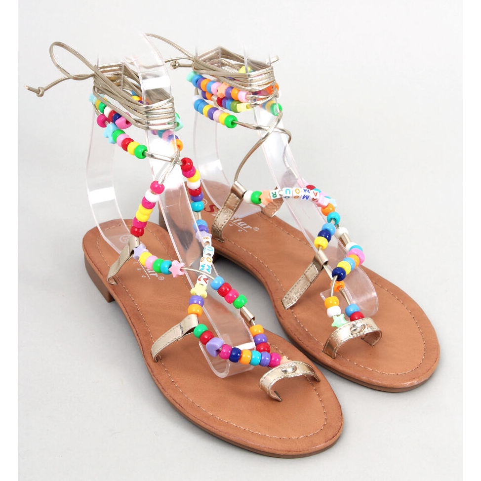 Découvrez des sandales BM Roman pour femme uniques avec des perles Megh Gold d'une couleur dorée insolite ! Ces chaussures romaines accrocheuses à semelle plate sont un incontournable de toute garde-robe estivale.