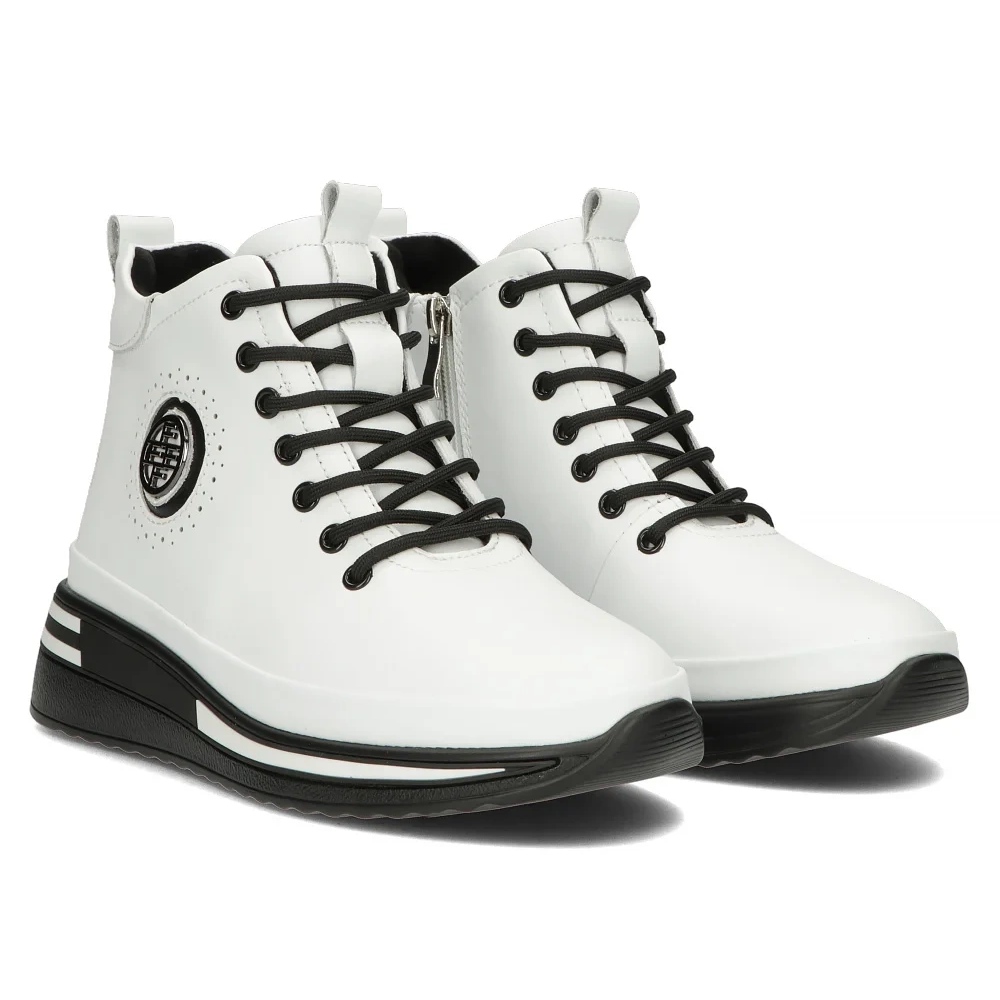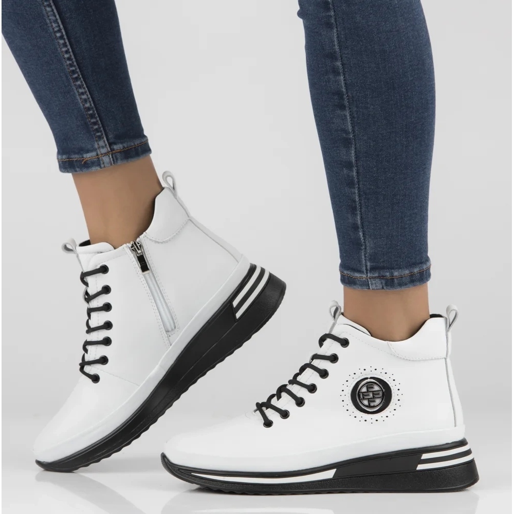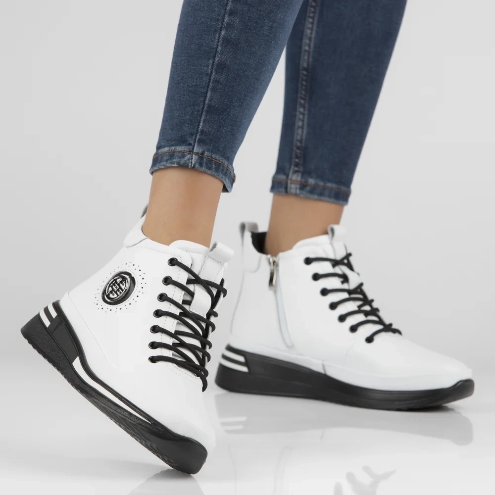 La hauteur de la plate-forme de 6 cm ajoute une subtilité et en même temps allonge optiquement les jambes, ce qui rend les pieds extrêmement attrayants. Le blanc, sans le motif, rend les bottes universelles, se combinant facilement avec diverses stylisations, à la fois décontractées et plus élégantes.