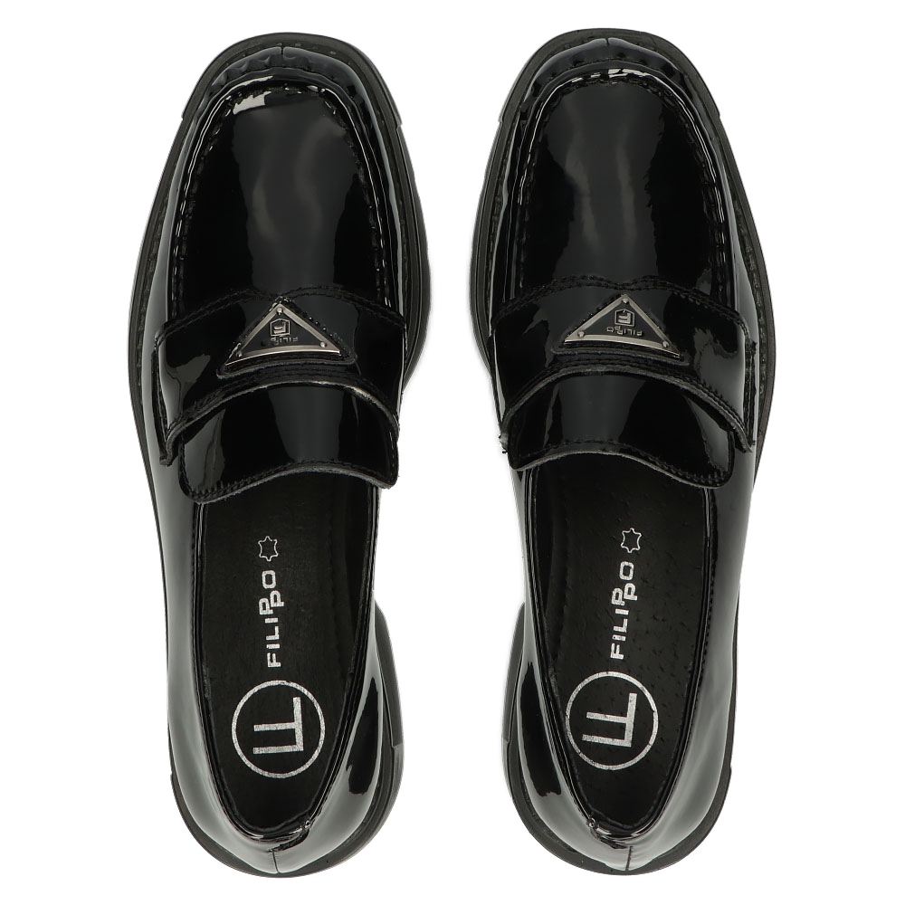 Les mocassins classiques Filippo dans une couleur noir verni et noir sont une proposition pour les femmes qui apprécient l'élégance et le confort. Fabriqué en cuir naturel de haute qualité - à la fois la tête supérieure et la semelle intérieure - combinez le style de déménagement avec la durabilité et le confort d'utilisation. Le logo décoratif sur le devant leur donne du caractère, et la semelle haute et le talon d'une hauteur de 4,3 cm façonnent subtilement la figure.