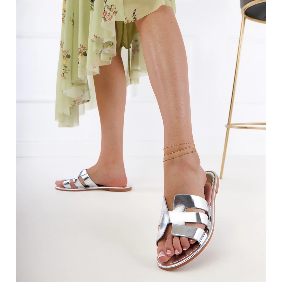 La couleur argentée avec une finition métallique attire l'attention, et un talon plat avec une hauteur de 1 cm assure la stabilité et le confort lors de la marche. Les pantoufles seront un excellent choix pour les sorties quotidiennes, que vous vous promenez dans la ville ou que vous rencontriez des amis. L'insert en cuir écologique s'occupe également du confort de vos pieds, et la semelle en plastique beige se fonde harmonieusement dans l'ensemble.