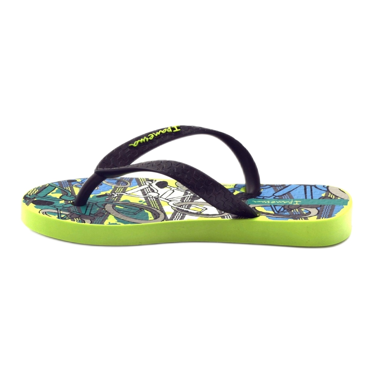 Les tongs Ipanema 81713 se caractérisent par une élégante couleur noire qui, combinée à une semelle vert vif, crée un design original et moderne. La partie intérieure des chaussures est décorée d'un motif cycliste intéressant, qui leur confère un caractère jeune. Ces tongs sont non seulement fonctionnelles, mais aussi élégantes, parfaites pour les garçons et les filles. Grâce à des sangles solides et épaisses qui maintiennent fermement le pied, les enfants peuvent courir et sauter librement.