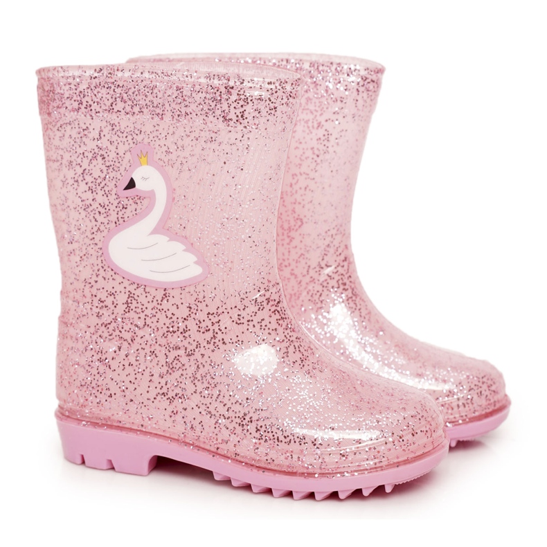 Nous vous proposons de découvrir de charmantes bottes en caoutchouc pailletées pour enfants avec un cygne rose et argenté ! Ces bottes de pluie uniques sont le choix parfait pour les jours de pluie, offrant à la fois confort et style.