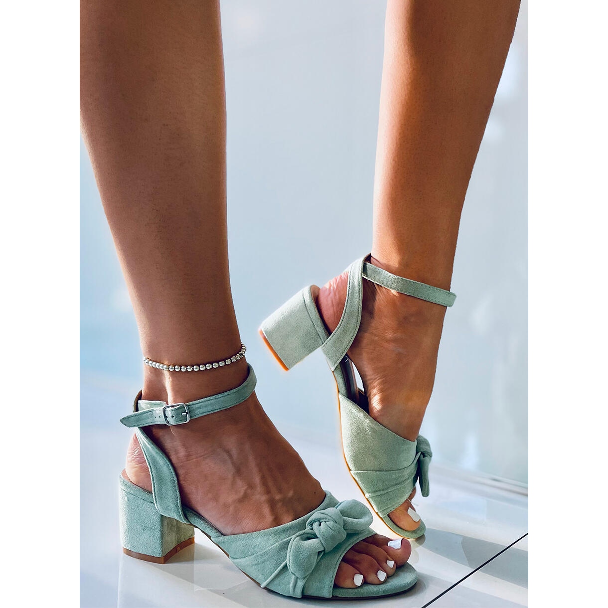 Découvrez les extraordinaires sandales à talons hauts Giselle en vert, qui seront le complément parfait à votre garde-robe de tous les jours. Fabriquées en daim écologique, ces chaussures élégantes se caractérisent par un design simple mais élégant, enrichi d'un nœud accrocheur. Grâce au fermoir réglable, ils mettent en valeur la cheville, ce qui ajoute un charme féminin et les rend extrêmement confortables à porter.