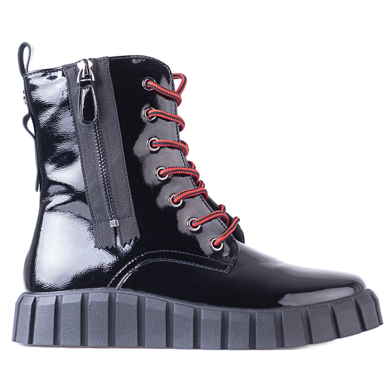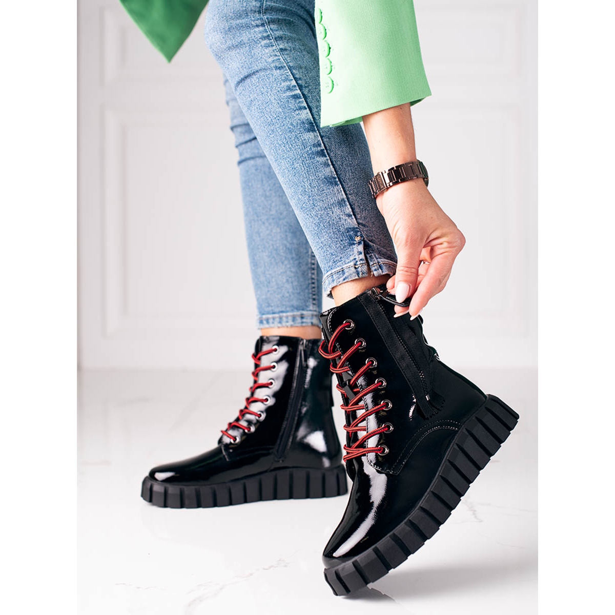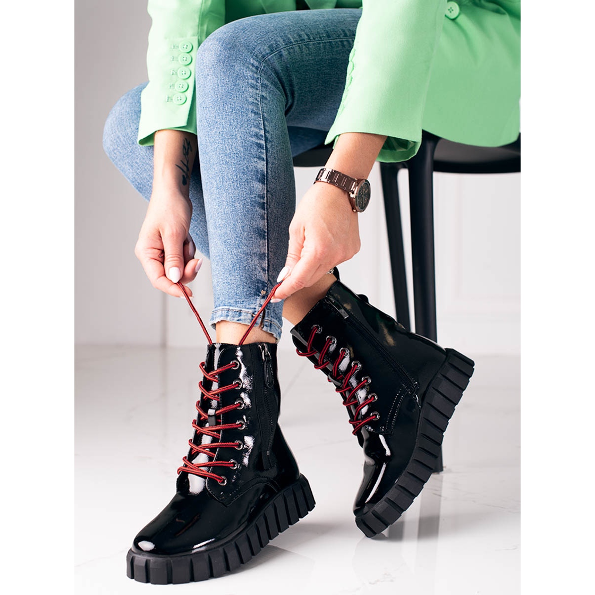 Les ouvriers noirs sont montés sur une semelle synthétique avec bande de roulement, ce qui augmente la traction et la stabilité. Un talon plat d'une hauteur de 3,5 cm et une plateforme d'une hauteur de 2,5 cm vous permettent de profiter d'un confort extraordinaire sans sacrifier une apparence à la mode.
