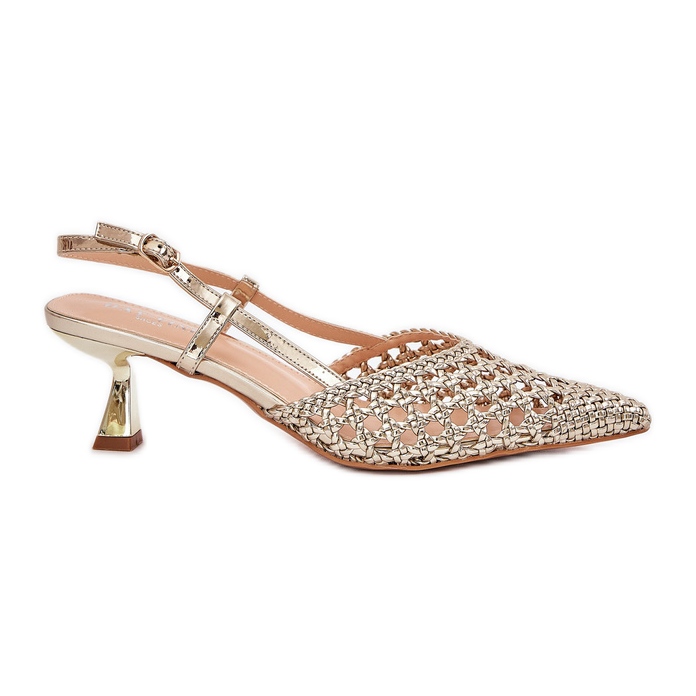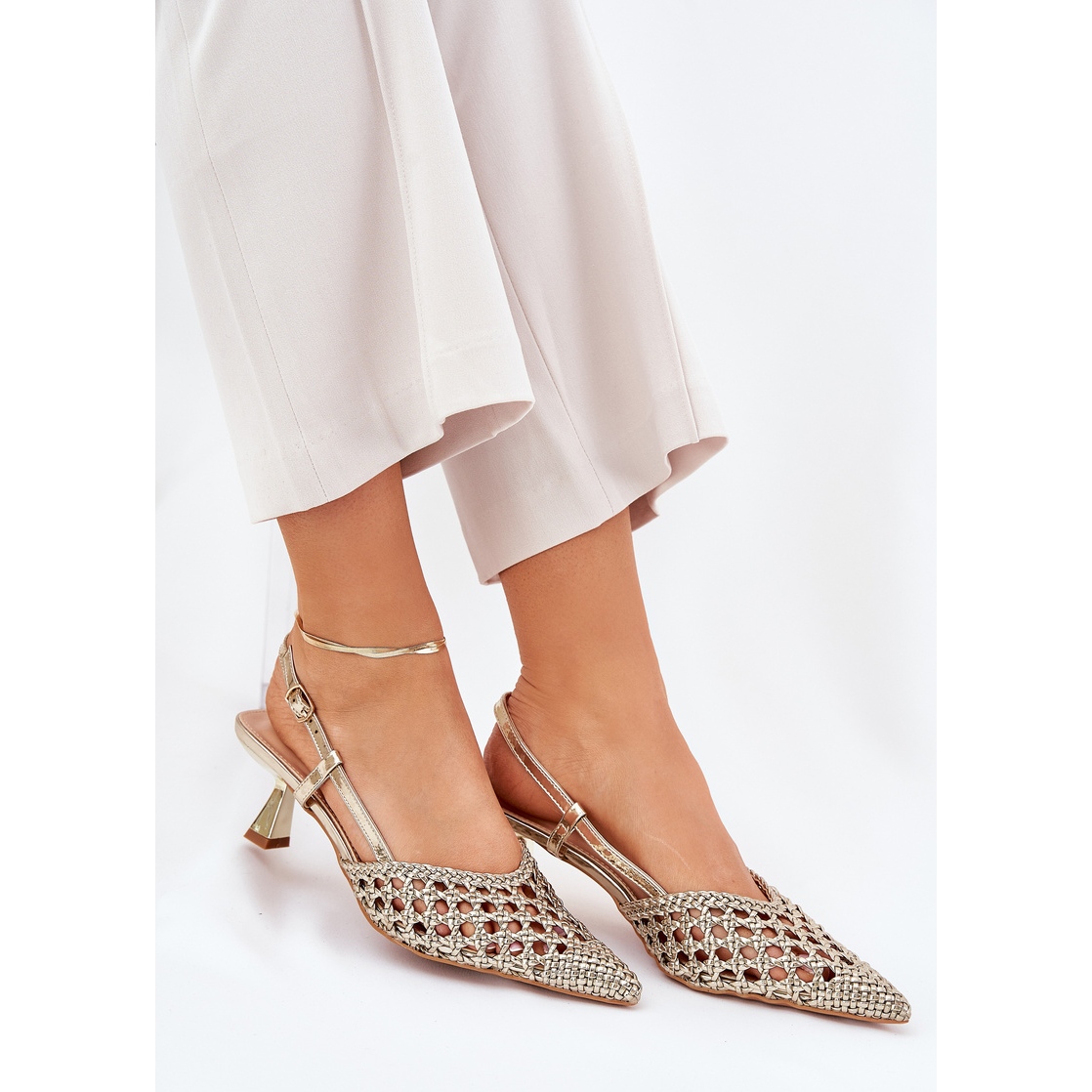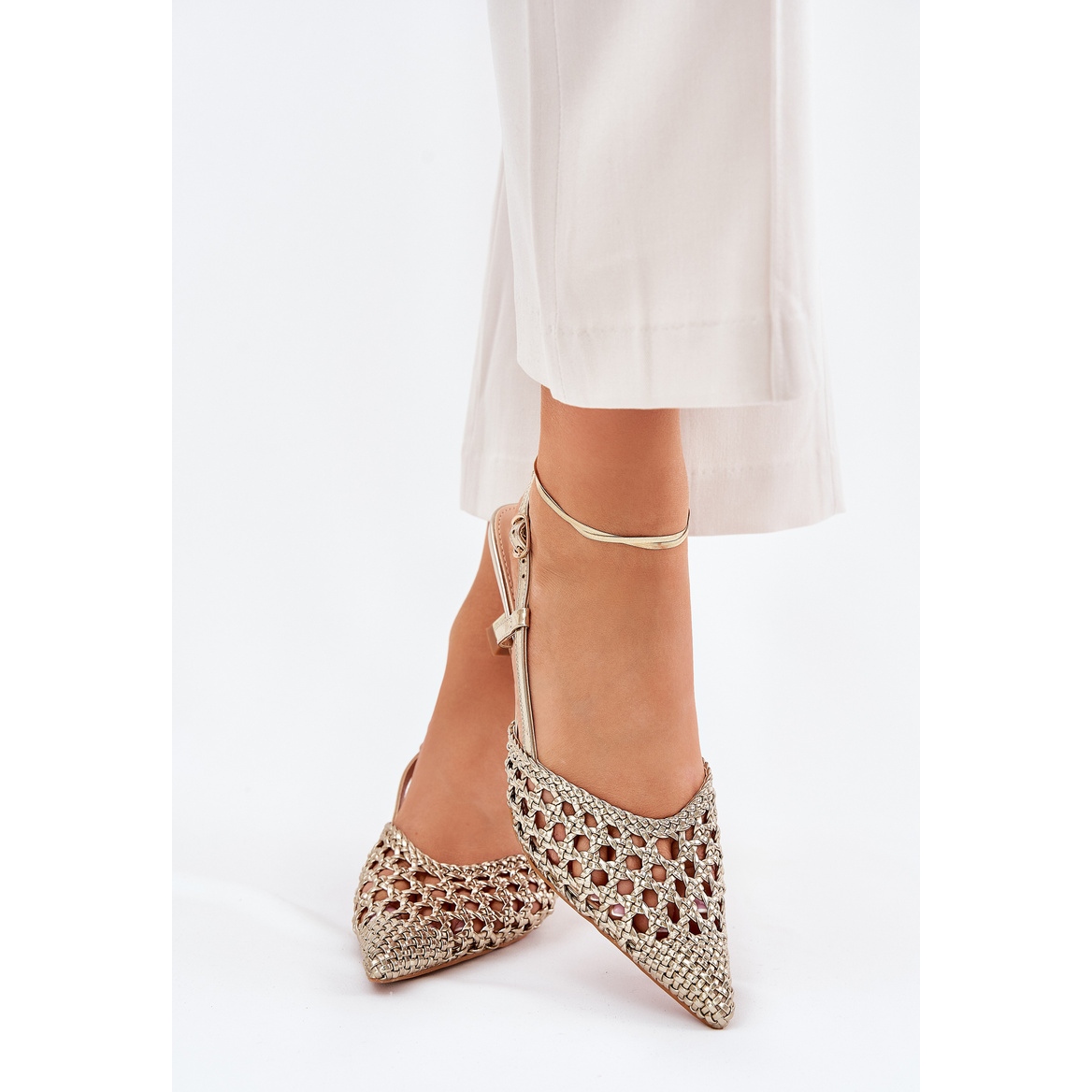 Nous présentons des talons hauts élégants avec un nez pointu et un talon ouvert dans une couleur dorée phénoménale, qui complètera parfaitement chaque stylisation du soir. Ce modèle unique, attaché d'une boucle, offre un ajustement parfait au pied, ce qui garantit non seulement le confort, mais aussi la confiance à chaque étape.