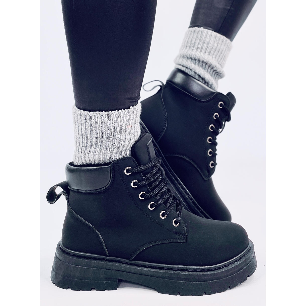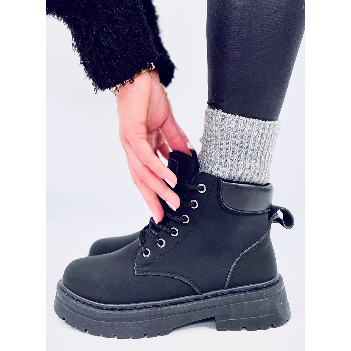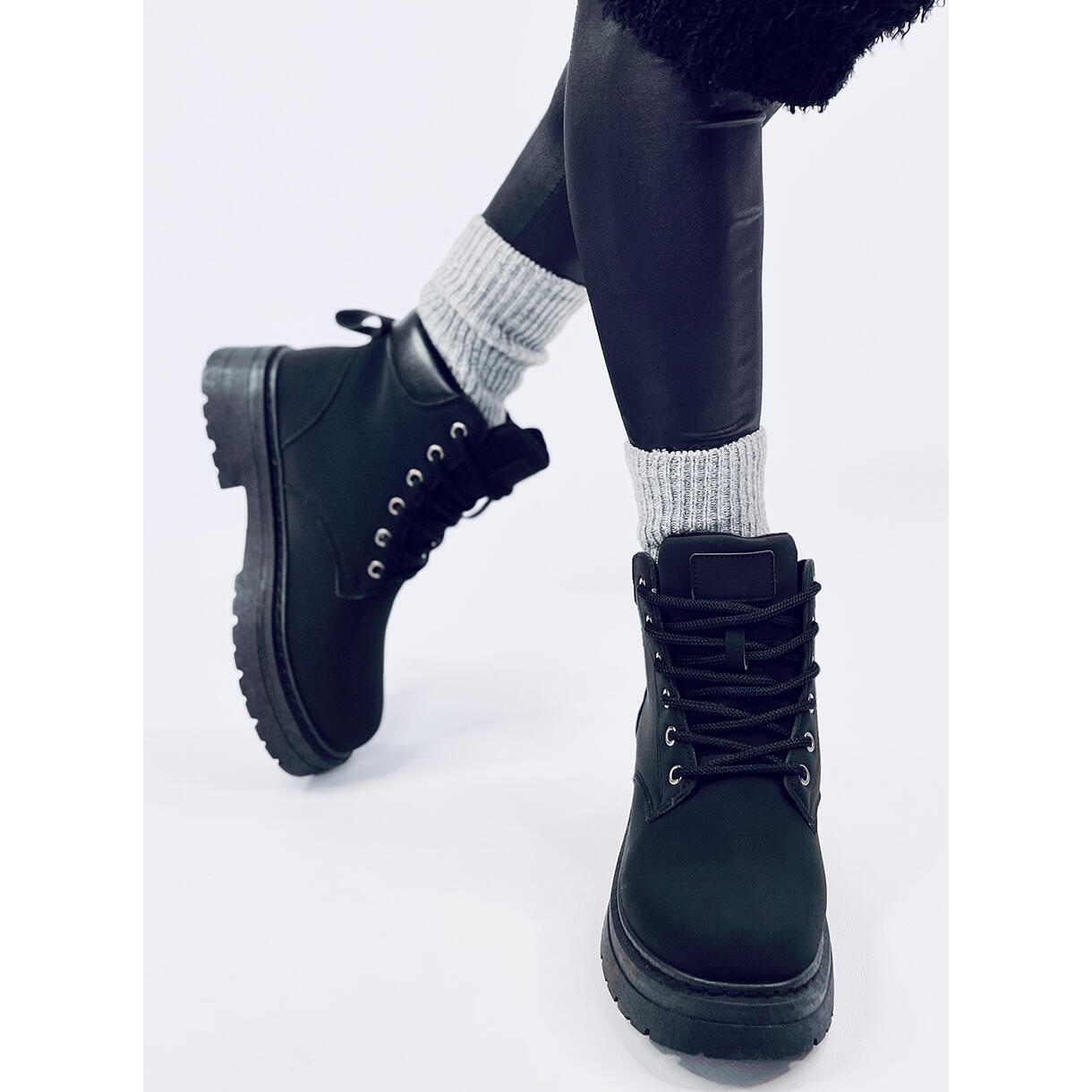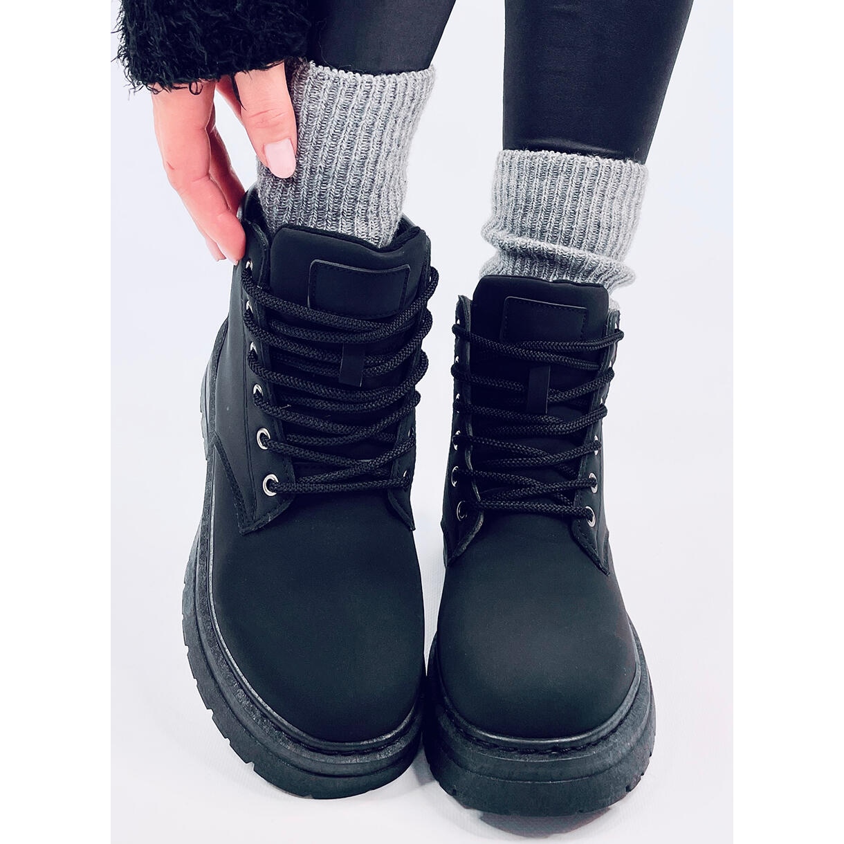 Les trappeurs étaient faits de cuir écologique Matt de haute qualité, qui fournit non seulement l'apparence esthétique, mais aussi la facilité de maintien. Leur hauteur pour la cheville et un fermoir intéressant en dentelle vous permettent de correspondre parfaitement à chaque tronçon du pied, ce qui fait du port de ces chaussures un réel plaisir.