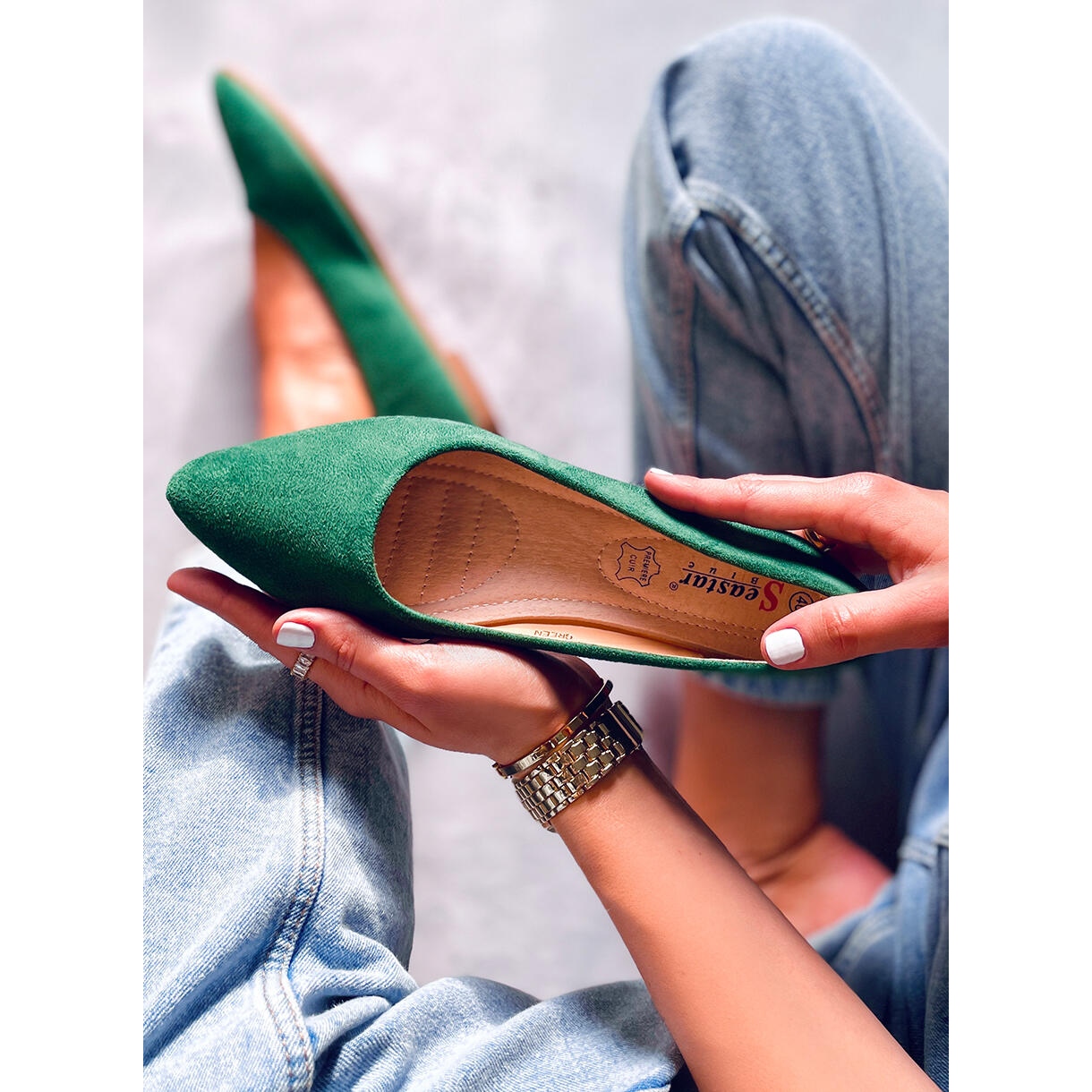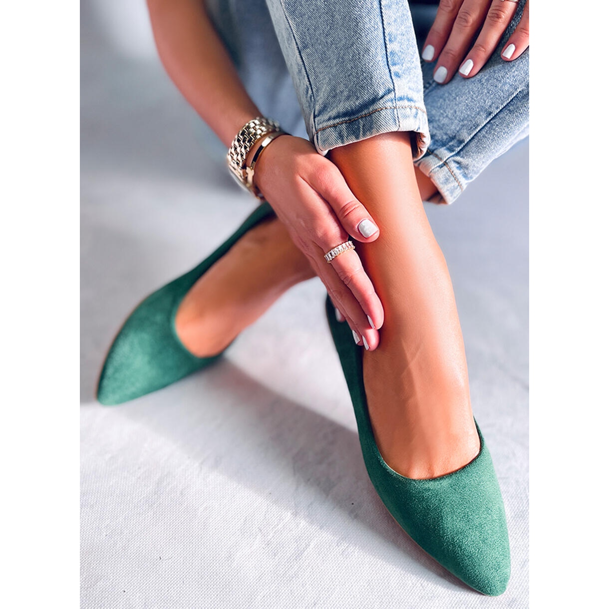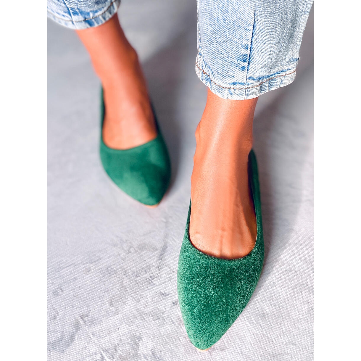 Le cuir suédé écologique est une matière qui, en plus de son aspect unique, est également facile à entretenir et résistante aux diverses conditions climatiques. Décorées dans une nuance uniforme de vert, ces ballerines attireront sûrement l'attention et se marieront bien avec de nombreux éléments de votre garde-robe.
