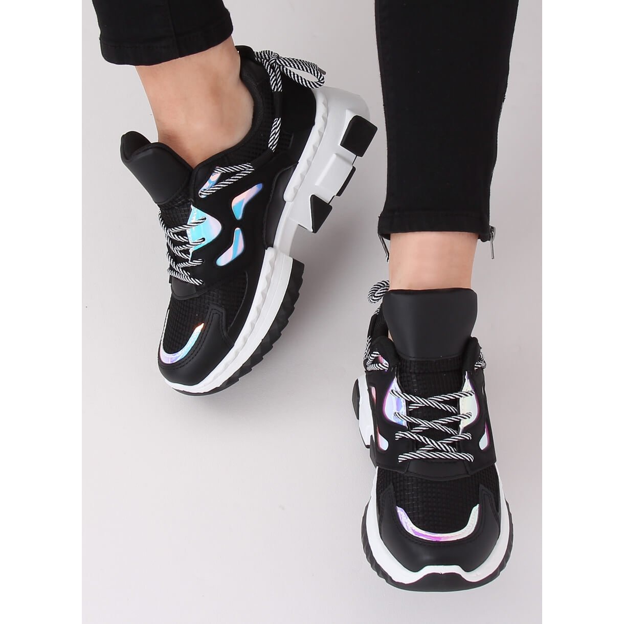 Découvrez les étonnantes chaussures de sport LA67P Noir, incontournables parmi les modèles femme de cette saison ! Ces chaussures originales impressionnent par leur semelle massive et ultramoderne, qui offre non seulement du confort, mais donne également du caractère à n'importe quel style. La finition noire s'associe parfaitement aux inserts holographiques qui attirent l'attention, et le charmant nœud avec lacets à l'arrière ajoute légèreté et charme féminin.