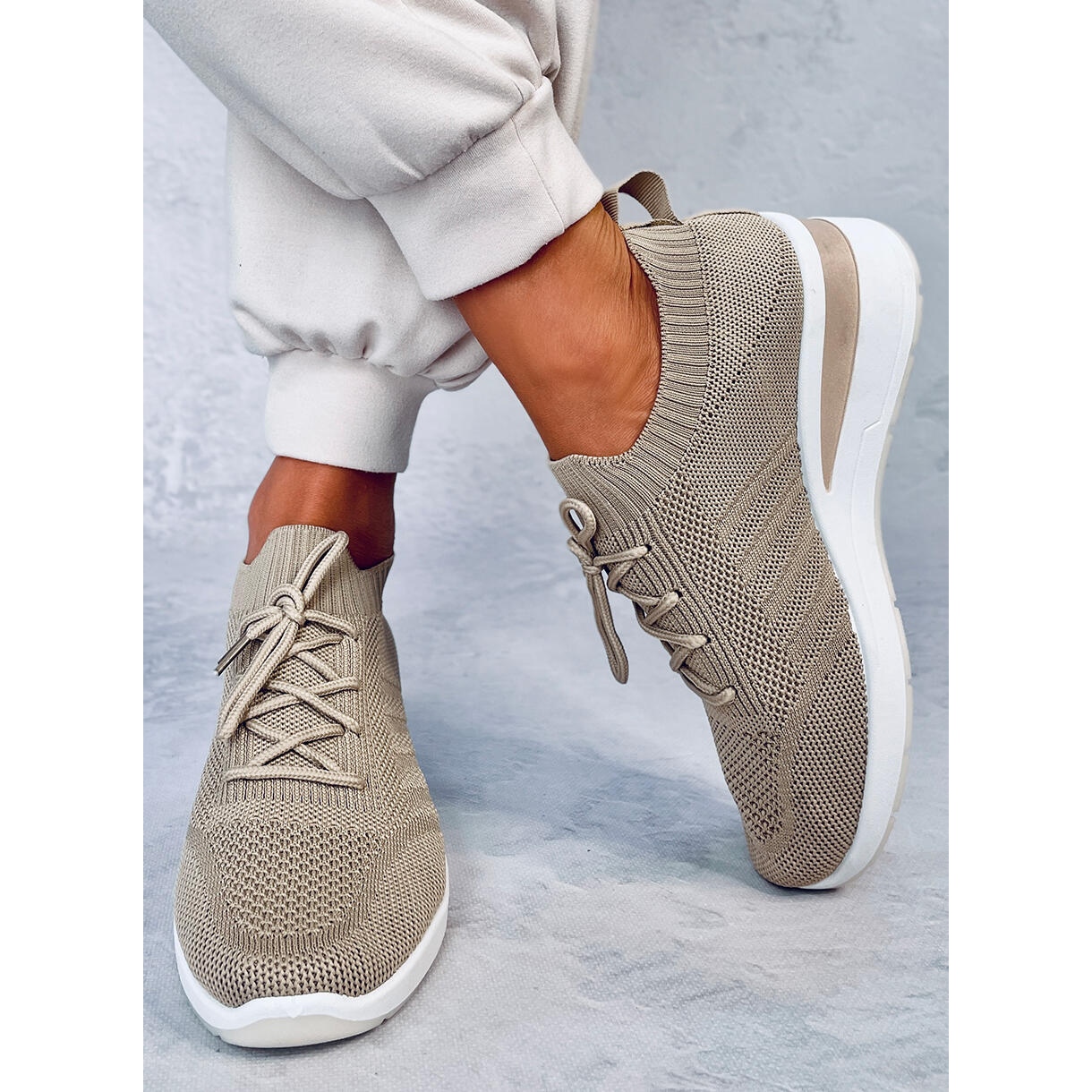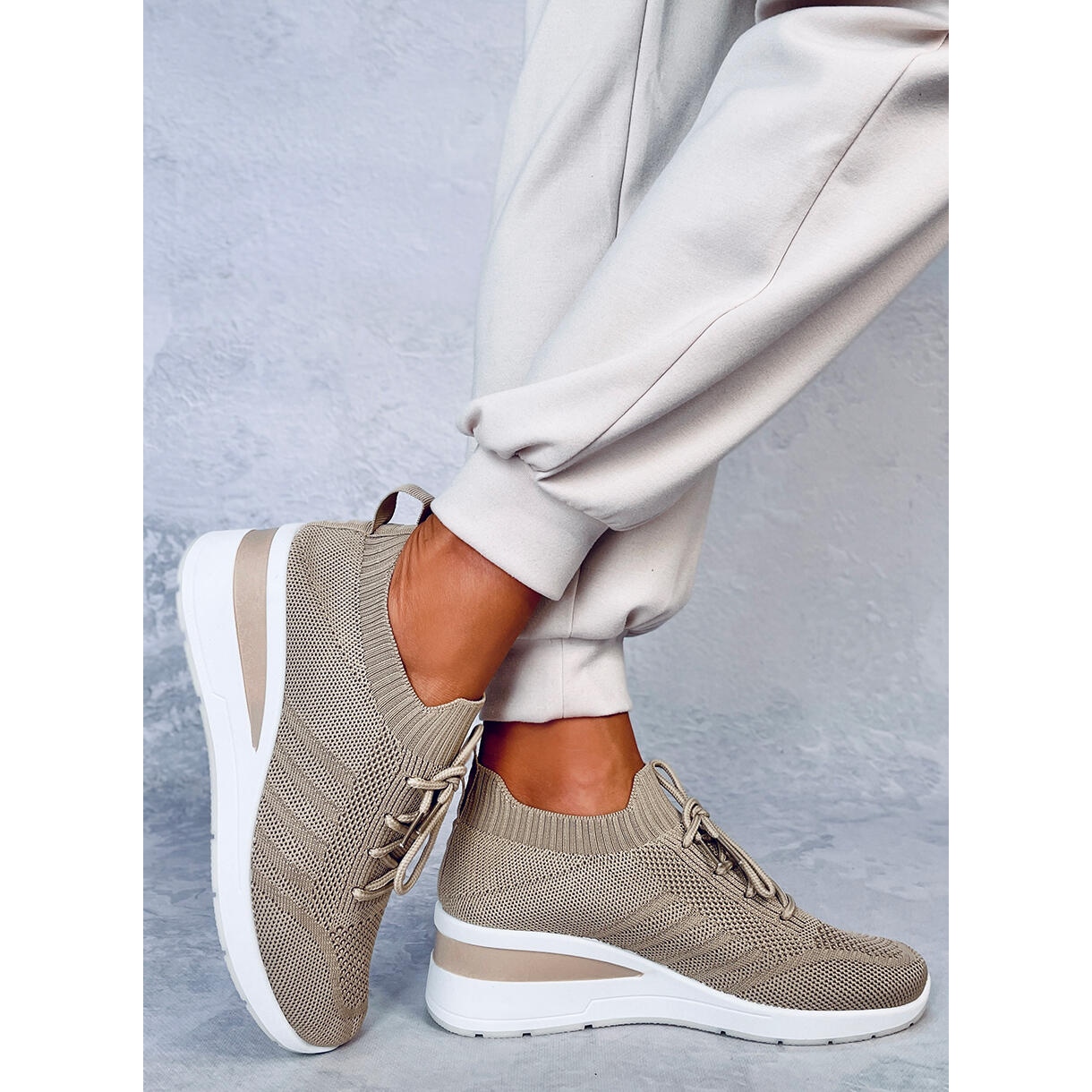 Les chaussures de sport compensées Leakes Khaki sont des baskets pour femmes de couleur beige. La cale de 5 cm de hauteur leur confère non seulement un style unique, mais souligne également la silhouette. Elles sont constituées d'un tissu souple qui s'adapte parfaitement à la forme du pied, assurant le confort.