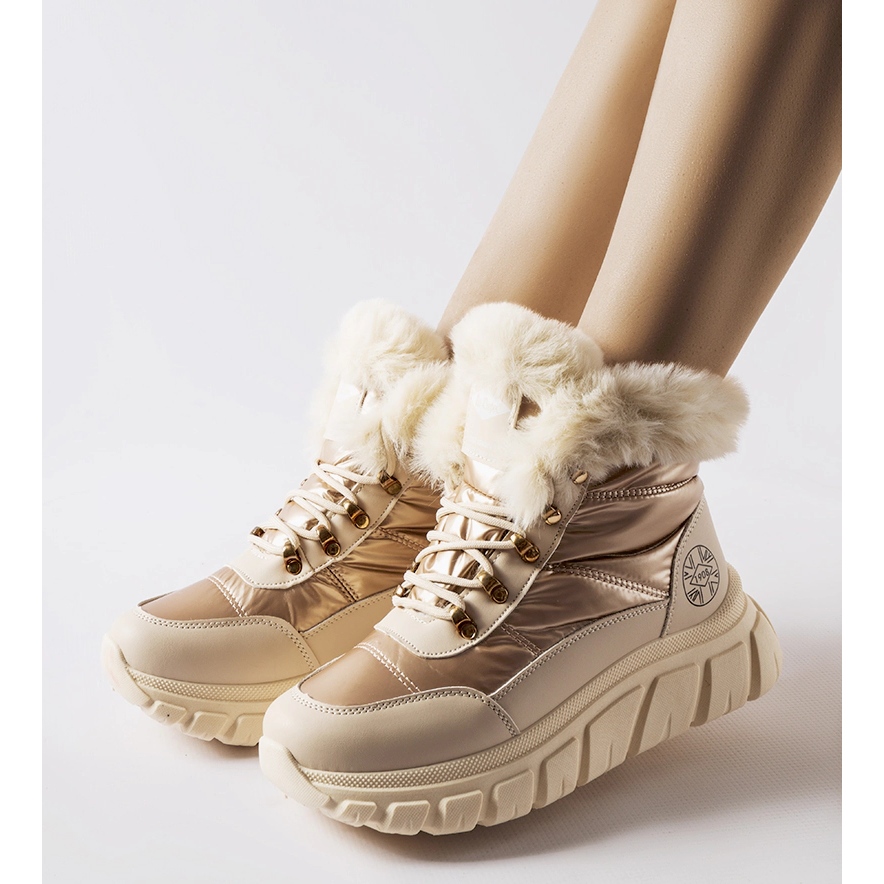La plateforme haute, de 4 cm de hauteur, permet d'isoler vos pieds de la surface froide et ajoute en même temps un caractère original aux chaussures. La hauteur des bottes de neige elles-mêmes est de 17 cm, ce qui offre une excellente protection contre le froid. Sans motif, mais avec une couleur dorée unique, les chaussures seront un parfait support dans la grisaille de l'hiver.