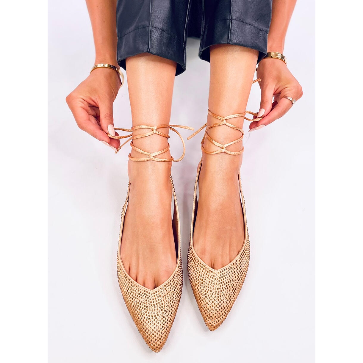 Habillez l'élégance et l'unicité des ballerines avec des zircons dans une nuance d'or! Ces chaussures uniques sont un excellent choix pour chaque femme qui veut combiner le style et le confort. Le modèle avec un talon ouvert, avec un talon plat classique, non seulement offre un confort, mais aussi une apparence efficace. Une coupe soignée avec des orteils rétrécies ajoute une subtilité, et la liaison sensuelle autour de la cheville met l'accent sur la féminité et fait que chaque stylisation prend un caractère unique.
