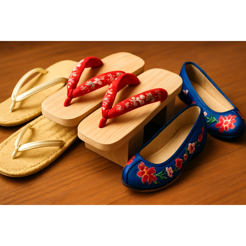 Les sandales geta en bois sont un élément emblématique de la culture japonaise. Ils se caractérisent par une plateforme en bois surélevée sur deux ou trois blocs, sur laquelle le pied est maintenu par une sangle passant entre les orteils. Ils servaient à l’origine à protéger le kimono de la boue et de l’humidité. La hauteur des plates-formes pouvait atteindre quinze centimètres, ce qui obligeait à de très petites marches, ce qui était considéré comme élégant. Les Zori sont des sandales plates portées dans des circonstances plus formelles, faites de paille de riz, de bois ou, aujourd'hui, de caoutchouc.