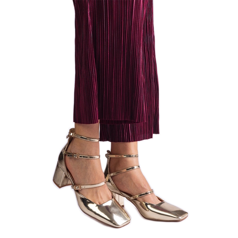 Les pompes dorées verni sur un poteau avec des boucles sont un choix de rêve pour les femmes qui veulent ajouter un peu d'éclat et d'élégance à leur look. Le modèle G10059, créé par un fabricant apprécié, combine la conception moderne de haute qualité. La couleur dorée métallique attire l'attention et s'adapte parfaitement avec diverses stylisations - du bureau à la soirée.