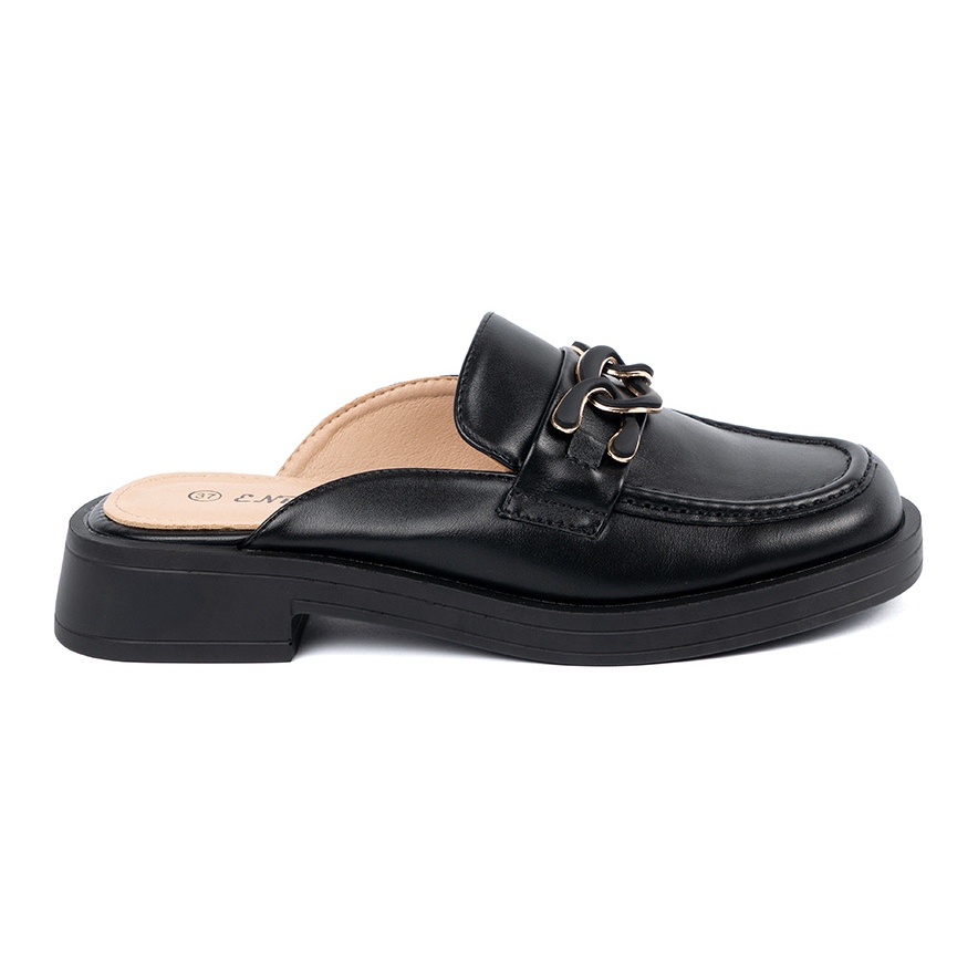 Détails: Shelvt Les tongs Black Low -heel Eco -reather flip avec une chaîne le noir