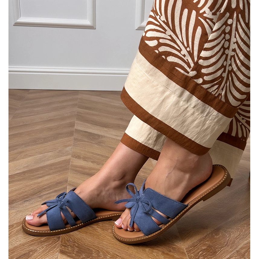Fabriqué en cuir en daim écologique de haute qualité, ils garantissent le confort lors du port, et leur talon plat avec une hauteur de seulement 1 cm en fait un excellent choix pour une promenade dans la ville et une détente sur la plage. Une couleur bleue élégante, rappelant les nuances de jeans, combinées à une semelle en plastique beige, permet une combinaison facile de tongs avec diverses stylisations d'été.