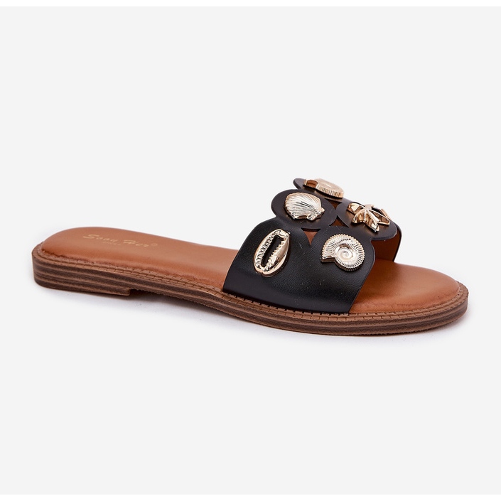 Détails: Les tongs des femmes à thèmes à thèmes avec des épingles dorées épingles noires le noir