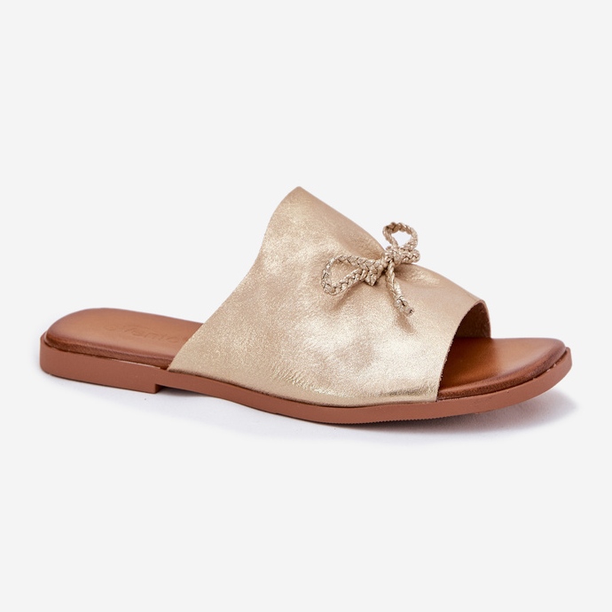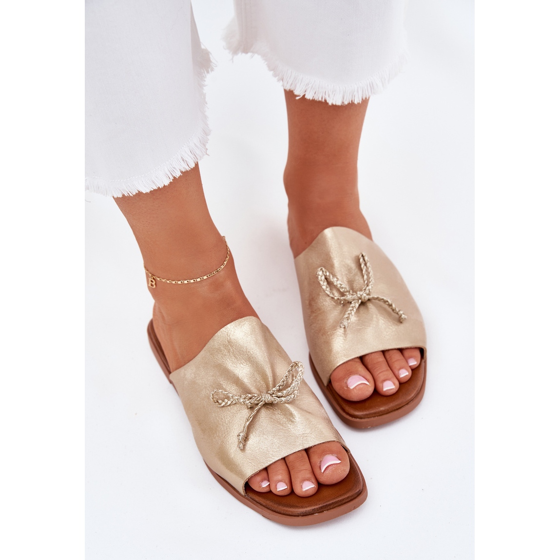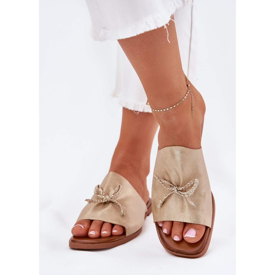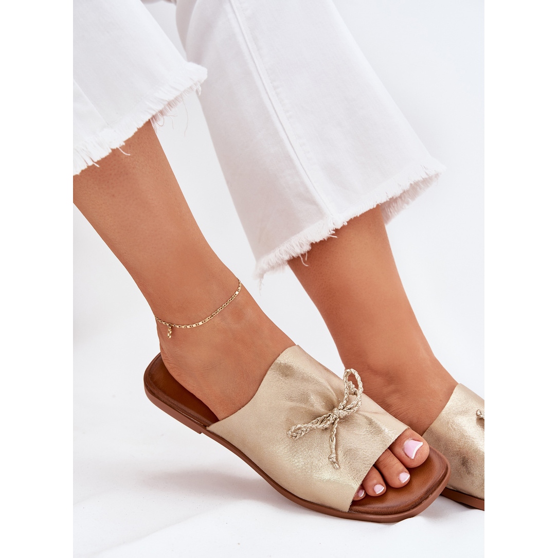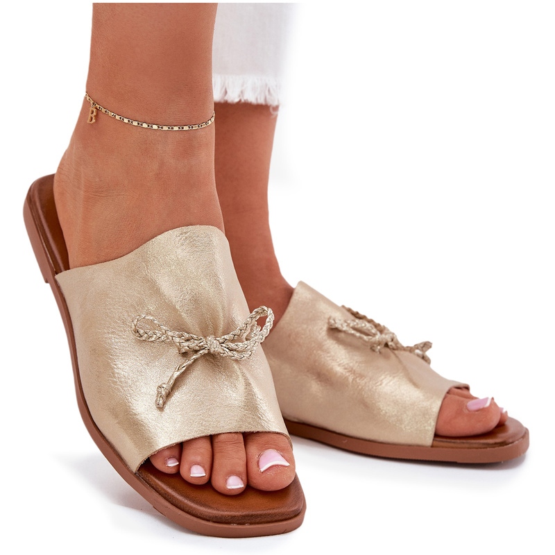 Nous présentons des événements élégants pour femmes pour femmes, qui seront le choix parfait pour les jours chauds. Fabriqués en cuir écologique de haute qualité, ces flip-flip dorés combinent le style et le confort. Leur reliure décorative subtile sous la forme d'un arc leur donne un caractère unique, les rendant belles en compagnie des robes d'été et des pantalons de matériaux élégants.