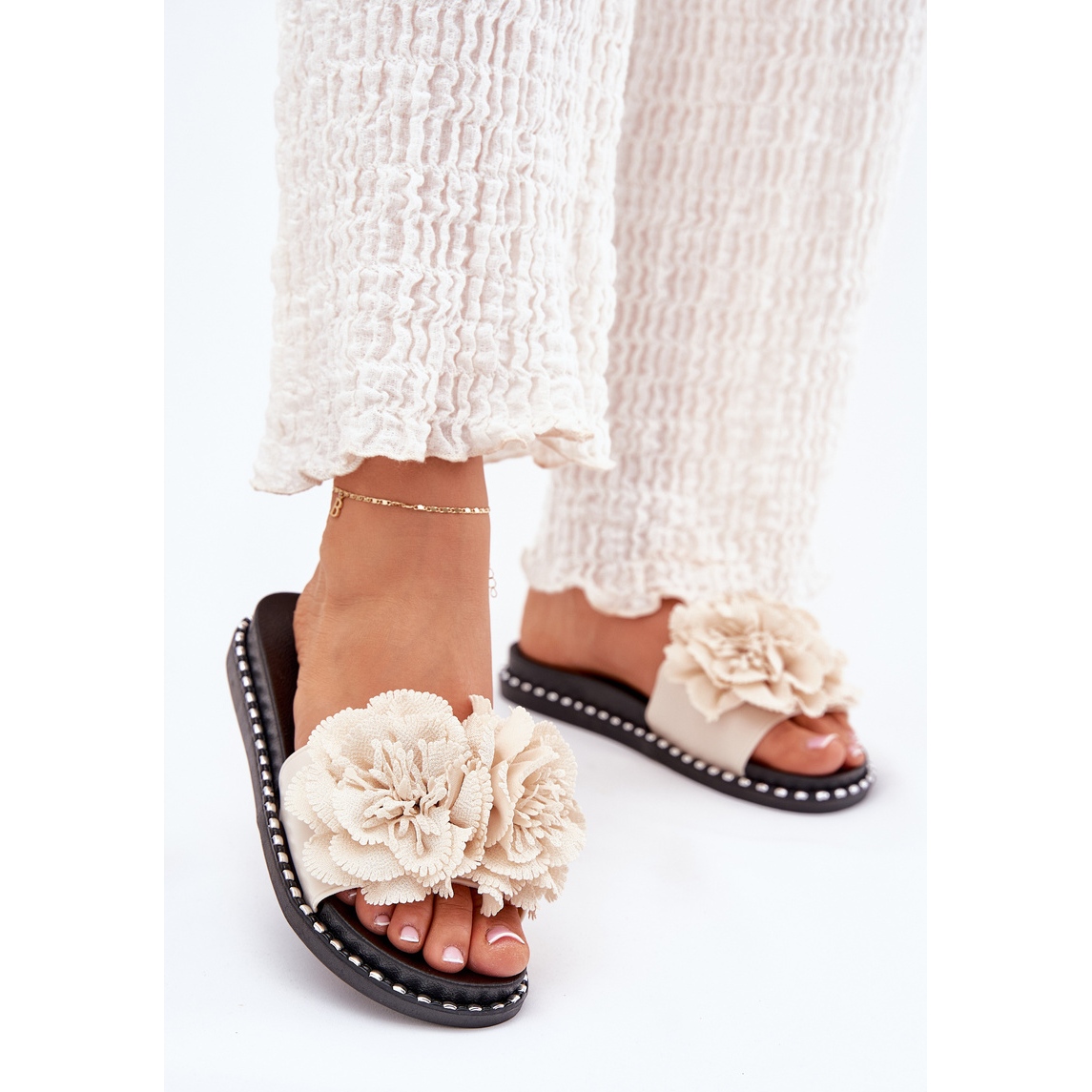 Détails: Les tongs des femmes avec des fleurs matérielles beige