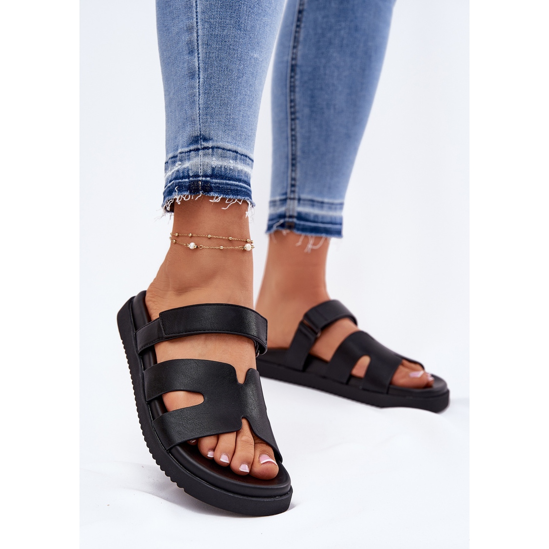 La sangle fermeture scratch est une solution pratique qui vous permet de faire correspondre avec précision les tongs, assurant leur stabilité et leur confort tout au long de la journée. Une finition noire et élégante fait que les tongs -flops se mélangent parfaitement avec des stylisations d'été - elles peuvent être facilement combinées avec des robes aérées et des shorts décontractés.