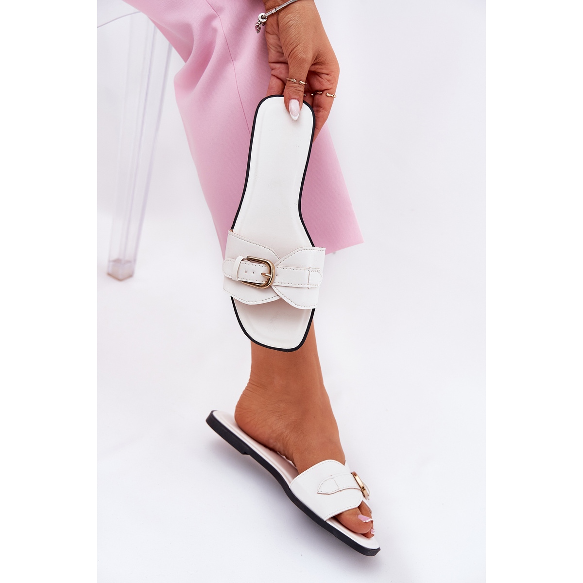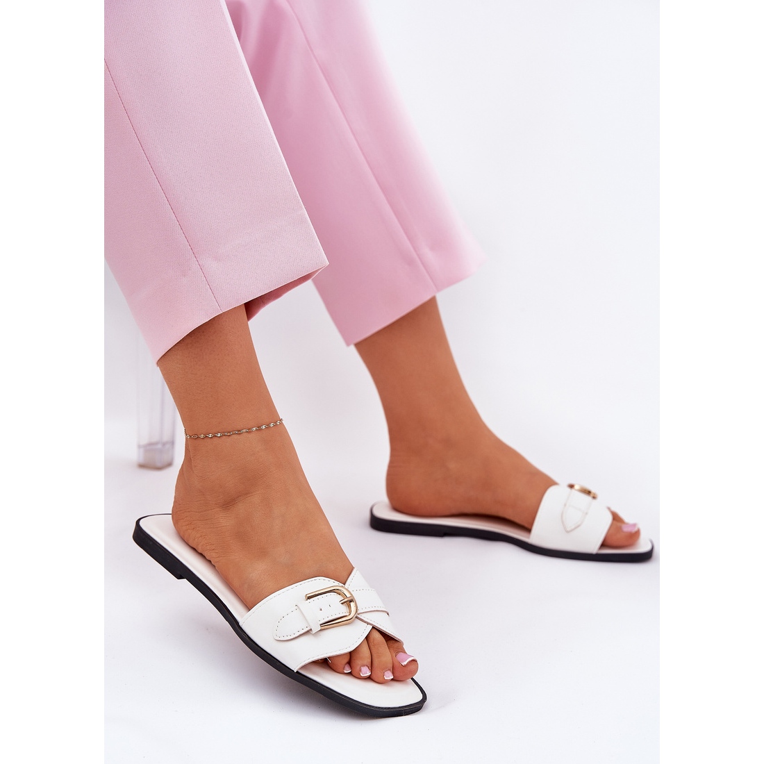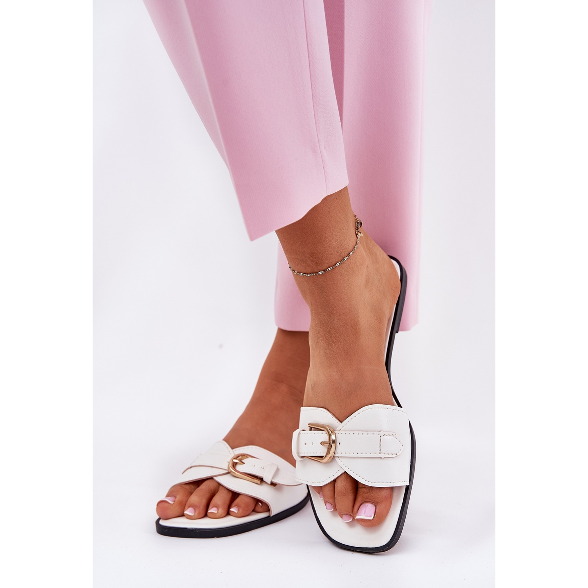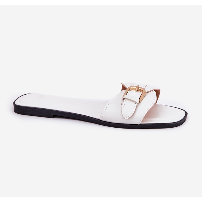Détails: Les tongs des femmes plates avec une boucle dorée blanche
