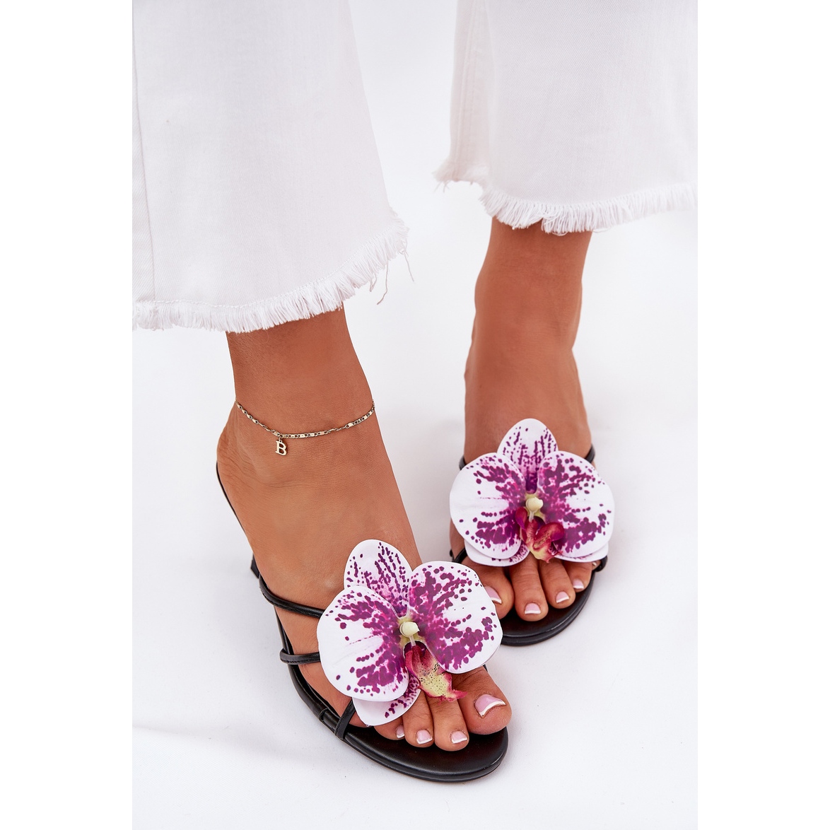Le modèle décoré d'une fleur subtile d'orchidée émane de la grâce féminine, complétant parfaitement les stylisations quotidiennes et en soirée. La hauteur du talon de 7 cm le rend optiquement allongé la figure, ajoutant son élégance et son style.